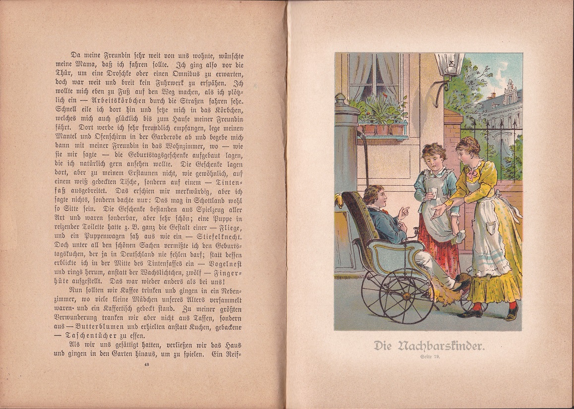 Mit einem Frontispiz und 2 weiteren farbigen Abbildungstafeln. Enthält die Erzählungen: Amtmanns Lucie (Sprengel). – Die Nachbarskinder (Sprengel). – Wasserverkäufer oder Prinz ? (Cassau).