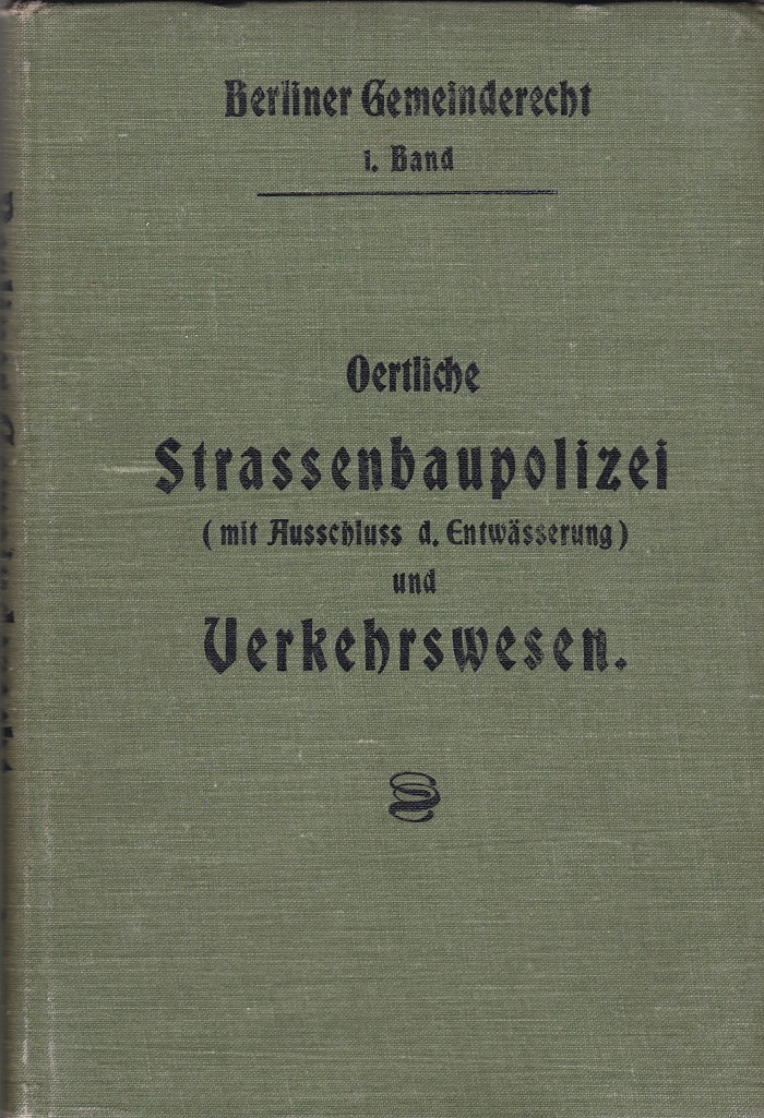 Oertliche Straßenbau-Polizei (mit Ausschluß der Entwässerung) und Verkehrswesen. Berlin: Loewenthal. (1902). IX,221 S. Original Leinwand mit Rücken- und Deckeltitel. Einband leicht berieben, beide Deckel an den Rändern stellenweise minimal gestaucht, Ecken etwas bestoßen, handschriftliche Nummer auf Innendeckel, 2 Eigentumstempel nebst handschriftlicher Nummer auf Titel und ein Stempel auf Titel verso, Klammerbindung etwas angerostet, sonst in gutem Zustand. (=Berliner Gemeinderecht, 1. Band).