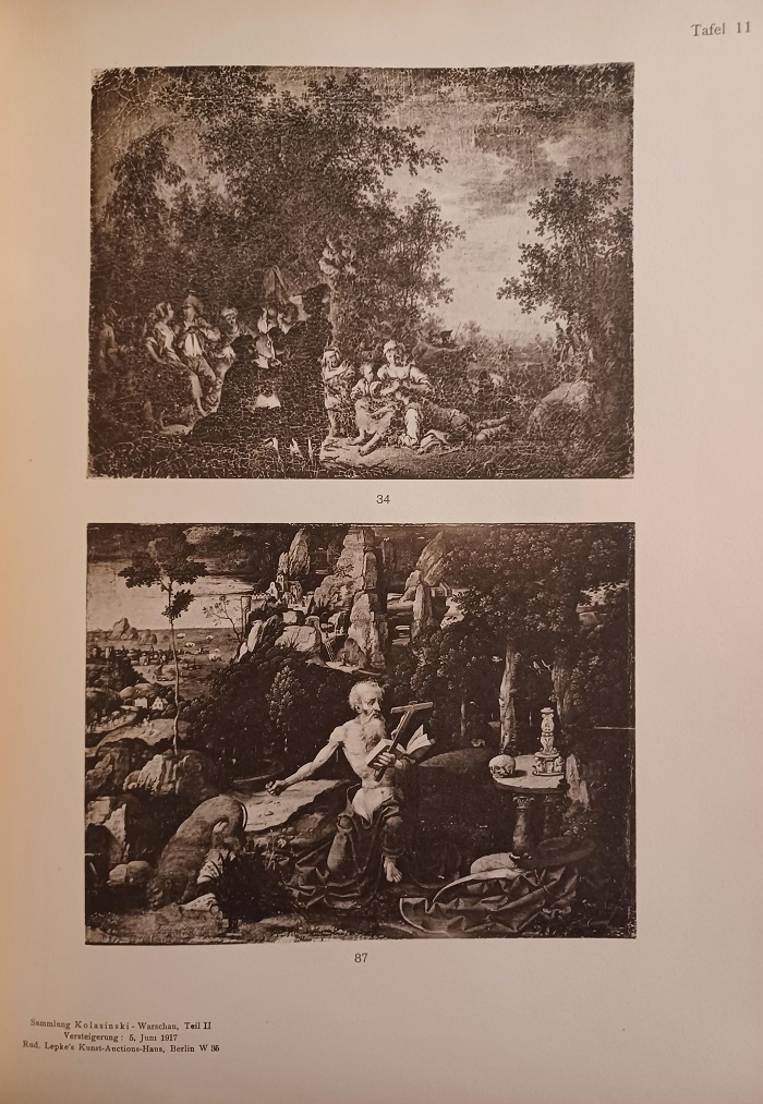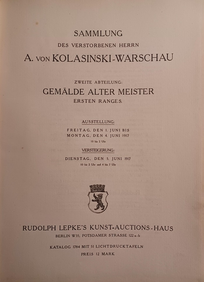 LEPKE. – Sammlung des verstorbenen Herrn A. von Kolasinski-Warschau. Zweite Abteilung: Gemälde alter Meister ersten Ranges. Ausstellung: Freitag, den 1. Juni bis Montag, den 4. Juni 1917. Versteigerung: Dienstag, den 5. Juni 1917. Rudolph Lepke’s Kunst-Auctions-Haus, Berlin W35, Potsdamer Strasse 122 a-b. Katalog mit 51 Lichtdrucktafeln. Berlin, 1917. 32,5 x 24,5 cm. 29 (1) S. + 51 Tafeln. Original Halbleinwand mit Rückentitel und montiertem Deckeltitel. Einband leicht berieben und fleckig, Ecken etwas gestaucht, Deckel etwas lichtrandig, innen gut erhalten. Mit 51 Abbildungs-Tafeln. Versteigert wurden Werke vor allem deutscher, niederländischer und italienischer Künstler.