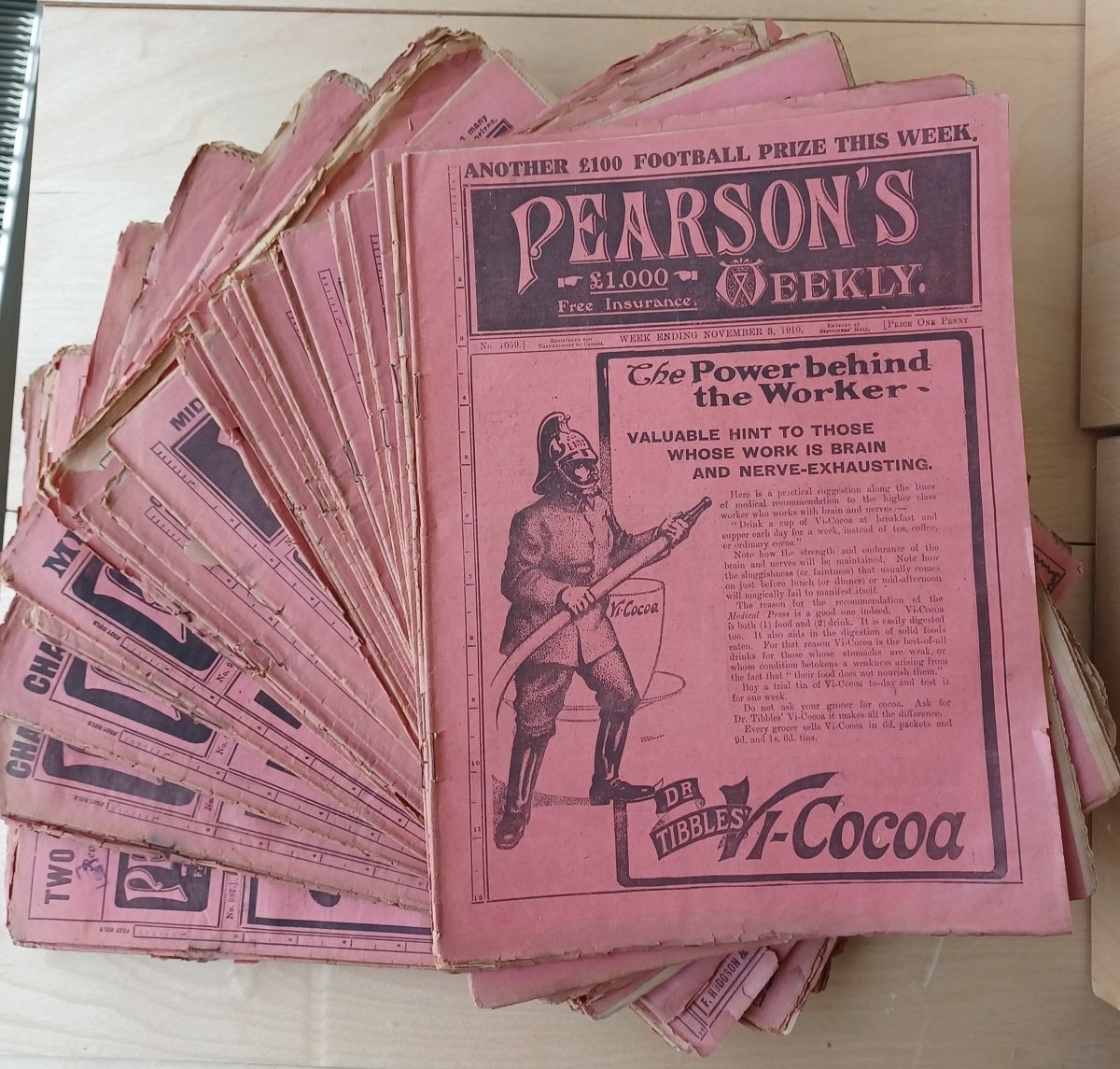 PEARSON, Arthur (Ed.): PEARSON’S WEEKLY. To Interest, To Elevate, To Amuse. 57 issues 1907 – 1912. London: Arthur Pearson, Ltd. 1907/1908/1909/1910/1911/1912. 4°. 34 x 25,5 cm and Gr.4°. 38 x 28 cm. (Mostly 20 p.). Original paper covers with title to front cover and advertising to both. Dusted and margined. Edges with little material loss, No.1142 and 1168 with bigger one. Inside paper yellowed, many tears (without material loss), partly waterstained, wire stapling rusted. Generally acceptable condition. 1907: No. 903 // 1908: No. 929, 946, 949, 951, 952, 953, 954, 955, 956, 957, 958, 959, 960 // 1909: No. 969, 971, 975, 983, 986, 987, 990, 992, 996, 1006, 1014, 1026 // 1910: No. 1023, 1025, 1029, 1030, 1031, 1059 // 1911: No. 1072 // 1912: No. 1142, 1146, 1147, 1148, 1149, 1150, 1151, 1152, 1154, 1155, 1156, 1157, 1158, 1159, 1160, 1161, 1164, 1165, 1166, 1167, 1168,1170, 1171, 1172. – – – ACHTUNG! Dieses Buch kann wegen seines Gewichts oder seiner Größe nur als PAKET verschickt werden. Innerhalb Deutschlands 5,80 Euro. (Portokosten ins Ausland bitte erfragen.) / ATTENTION! Due to its weight or size this book can only be sent as a PARCEL. Within Germany 5,80 Euro (For shipment abroad please ask).