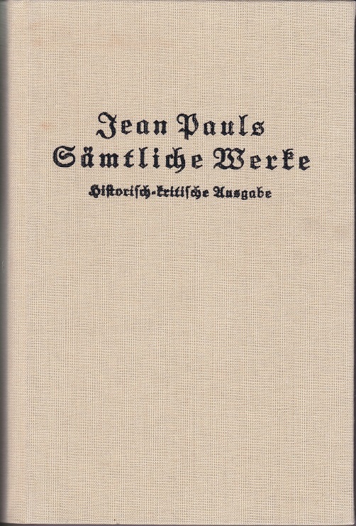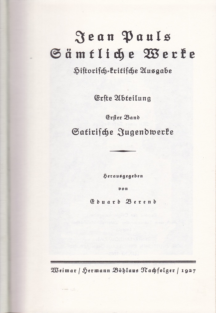 JEAN PAUL (das ist J. P. F. Richter): Jean Pauls Sämtliche Werke, Erste Abteilung: Zu Lebzeiten des Dichters erschienene Werke. Erster Band: Satirische Jugendwerke. Historisch-kritische Ausgabe. Herausgegeben von der Preußischen Akademie der Wissenschaften in Verbindung mit der Akademie zur wissenschaftlichen Erforschung und zur Pflege des Deutschtums (Deutsche Akademie) und der Jean-Paul-Gesellschaft. (Reprint der Originalausgabe Weimar; Böhlaus Nachfolger, 1927). Leipzig: Zentralantiquariat der DDR. (1985). XLIV,583 S. (Fraktur). Original Leinwand mit Rücken- und Deckeltitel. Einband etwas fleckig, innen sehr guter Zustand. (= Sämtliche Werke. Abteilung I, Band 1).