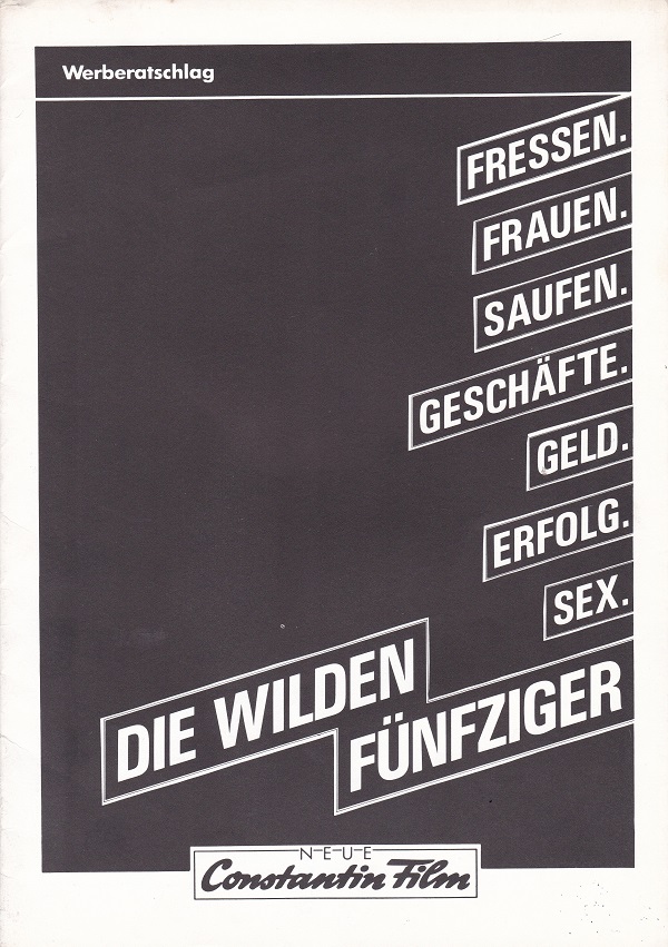 ZADEK, Peter.– NEUE CONSTANTIN FILM: Peter Zadek: Die wilden Fünfziger. (Konvolut von 24 Aushangbildern, 3 Schrifttafeln, Werberatschlag und Rundbrief). München, (1983). 30 x 24 cm. (Plakat gefaltet). Bilder und Schrifttafeln 30 x 24 cm. Plakat ausgefaltet ca. 110 x 82 cm.Werberatschlag: bedruckter Kartonumschlag mit eingelegten 8 Blatt. Rundbrief. 1 Blatt. 2 der Schrifttafeln ein wenig fleckig, sonst gut erhalten.