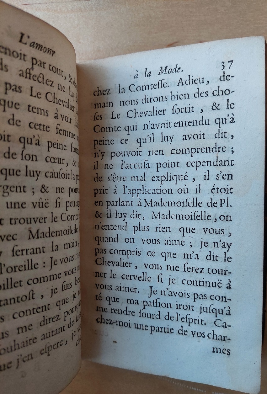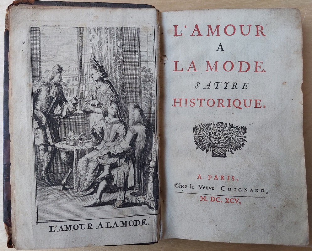 [ PRINGY, Jeanne-Michelle de]: L’Amour à la mode, satyre historique. Paris: Coignard. 1695. Kl.8° (ca. 15,6 x 10 cm). (20)190 S. Ledereinband der Zeit mit kaum noch lesbarem goldgeprägtem Rückentitel. Einband stärker berieben, an den Kanten abgerieben, Rücken oben mit 2 cm Fehlstelle. Vorsätze stockfleckig, innen nahezu stockfleckenfrei. Anonym erschienene Erstausgabe. – CERL Thesaurus. – Französische Schriftstellerin (1660-1709), wenig Information siehe Wikipedia. – Mit gestochenem Frontispiz. – FRBNF31152096: „Par Mme de Pringy, d’après Barbier; a aussi été faussement attribué à Michel Chilliat.“