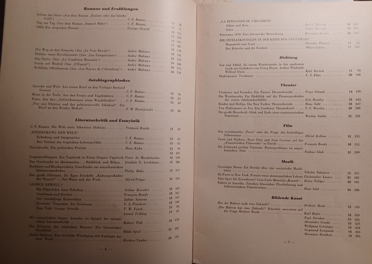 Ausführliches Inhaltsverzeichnis für den Zweiten Jahrgang aufgeschlüsselt in die verschiedenen Rubriken der einst bedeutenden Zeitschrift, mit Autorenregister und einem Verzeichnis der Illustrationen. – Die Zeitschrift „Der Monat“ aus dem Umfeld der amerikanischen politisch-kulturellen Organisation „Kongress für kulturelle Freiheit“ veröffentlichte regelmäßig Beiträge namhafter Autor/innen. Pro-westliche Positionen sollten hier gestärkt werden, politisch links stehende Intellektuelle marxistischen Einflüssen entzogen werden. Die Zeitschrift war Kind ihrer Zeit und Ort für kulturelle Publizistik in der Periode des Kalten Krieges. Für die Zeitschrift schrieben über Jahrzehnte hinweg bedeutende Autor/innen wie Theodor Adorno, Hannah Arendt, Czeslaw Milosz, Witold Gombrowicz, Albert Camus, André Gide, Karl Jaspers, Walter Laqueur, Golo Mann, Bertrand Russell, Walter Boehlich, Ernst Robert Curtius, Ekkehard Krippendorff, Herfried Münkler und viele andere. Die Liste mit den Beiträgen über bedeutende Akteure aus Kultur, Wissenschaft und Politik ist lang und gewichtig. Für ein Verständnis des Kalten Krieges auf intellektuell-kulturellem Terrain sowie zugleich für Einblick in die westdeutsche Diskussion über ein neues deutsches Selbstverständnis nach der Zäsur 1945 ist diese Zeitschrift ein wichtiges Kompendium. Die Zeitschrift erschien von 1948 bis 1971 mit insgesamt 270 Heften. Im Oktober 1978 wurde eine Wiederbelebung der Zeitschrift unternommen, mit Heft 1, bzw. Nr. 271ff, in vierteljährlicher Erscheinungsweise. Endgültig eingestellt wurde die Zeitschrift dann mit dem Jahr 1987.