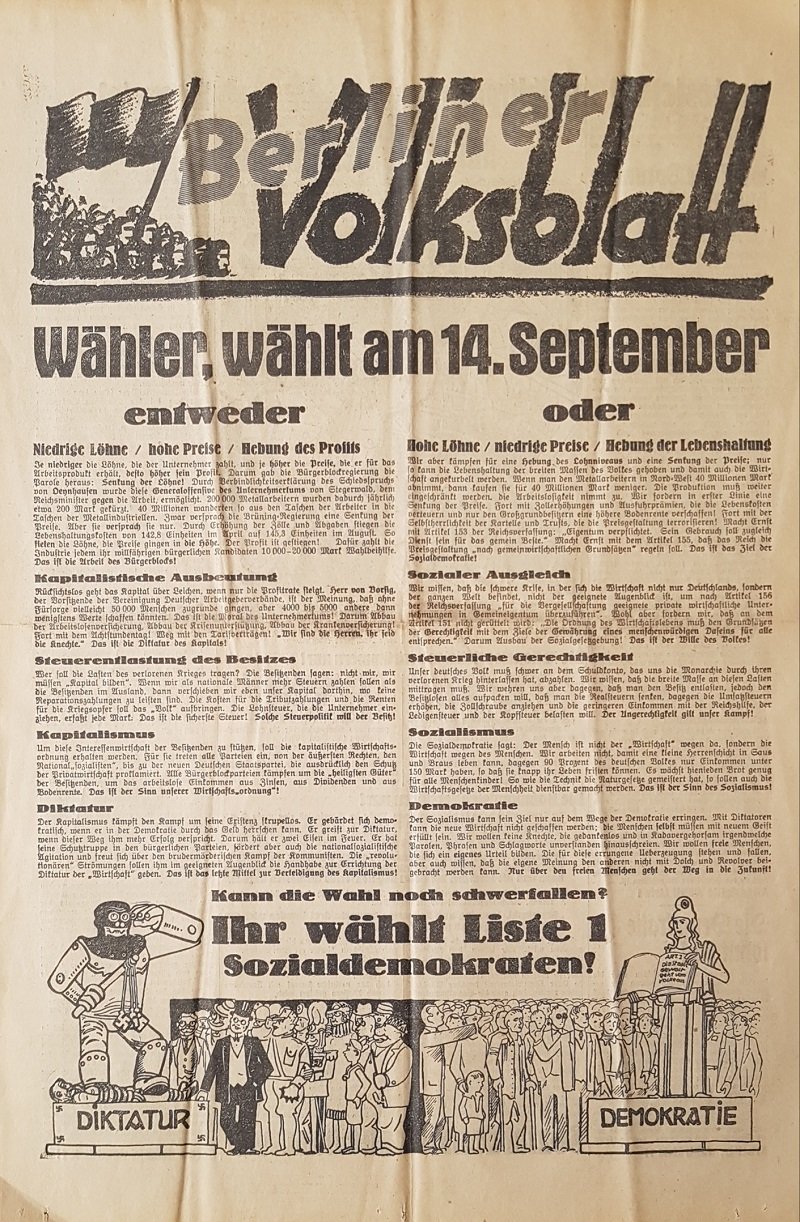 KÜNSTLER, Berliner Volksblatt. Wahlwerbung der SPD für die Reichstagswahl am 14.