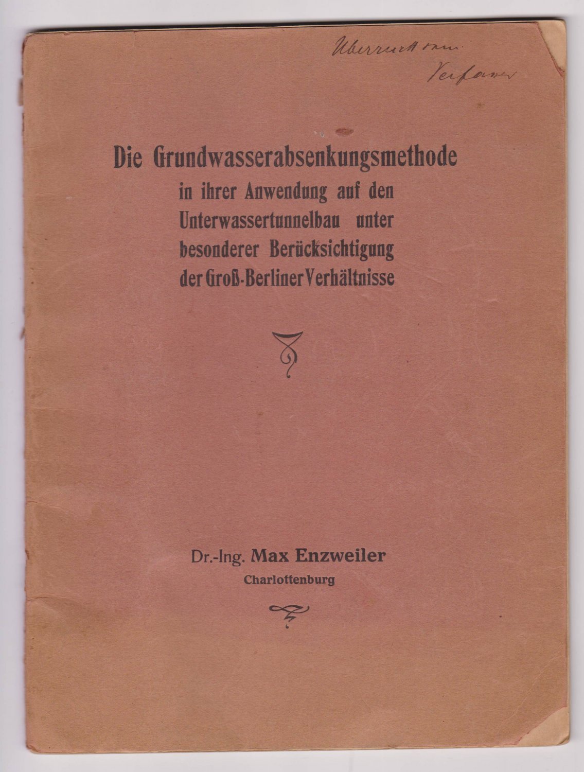 ENZWEILER, Max: Die Grundwasserabsenkungsmethode in ihrer Anwendung auf den Unterwassertunnelbau unter besonderer Berücksichtigung der Groß-Berliner Verhältnisse. (Mit handschriftlicher Verfasserwidmung!). Berlin-Charlottenburg: Opitz. (1918). (ca. 24,3 x 18,4 cm). 55 S. Original-Karton mit Deckeltitel. Einband etwas berieben und verblichen, an den Ecken mit Fehlstellen. Papier innen etwas gebräunt, privater Stempel auf dem Titelblatt, sonst gut erhalten. Altersentsprechend guter Zustand.