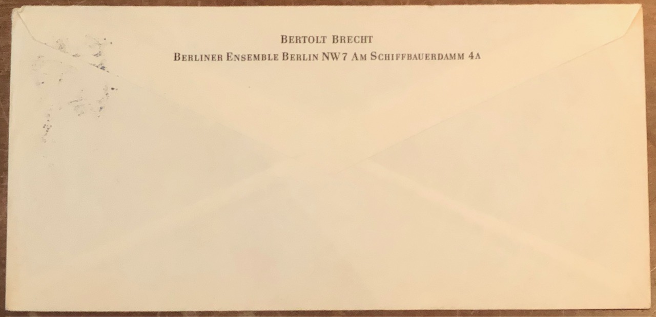 BRECHT, Bertolt: Offener Brief an den deutschen Bundestag. (Original-Brief von 1956 zur Wiedereinführung der Wehrpflicht in der BRD). Berlin/DDR. 1956. (ca. 29,7 x 21 cm). 1 Blatt, mit Original-Briefumschlag. Gedruckter Original-Brief mit Brechts Briefkopf, Datierung und faksimilierter Signatur. Papier wurde gefaltet, leicht knickspurig, sonst gut erhalten. Brecht richtete seinen bekannten Offenen Brief von 1956 an die deutschen Künstler und Schriftsteller sowie an die deutsche Öffentlichkeit überhaupt. Er verfasste diesen Brief angesichts der drohenden Wiedereinführung der Wehrpflicht in der BRD. Er schrieb: „Als ich ein junger Mann war, gab es in Deutschland eine Wehrpflicht und ein Krieg wurde begonnen, der verloren ging. Die Wehrpflicht wurde abgeschafft, aber als Mann erlebte ich, dass sie wieder eingeführt wurde, und ein zweiter Krieg wurde begonnen, größer als der erste. Deutschland verlor ihn wieder und gründlicher, und die Wehrpflicht wurde wieder abgeschafft. […] Jetzt, an der Schwelle des Alters, höre ich, dass die Wehrpflicht zum dritten Mal eingeführt werden soll.“ Brecht sprach sich in seinem Brief gegen eine Wehrpflicht in beiden deutschen Staaten aus. Der Brief wurde, wie schon sein Offener Brief von 1951, berühmt und wird bis heute zitiert. Der Brief enthält im Briefkopf Name und Datierung. Er umfasst insgesamt etwa 25 Zeilen. Der Brief wurde gedruckt und enthält unten die faksimilierte Signatur von Brecht, nur die Anrede „Sehr geehrter Herr Professor“ wurde wohl mit der Schreibmaschine manuell eingegeben. Er ist auf den 3. Juli 1956 datiert. Brecht richtete den Brief an den deutschen Bundestag. Er wurde im „Neuen Deutschland“ veröffentlicht und von Brecht an westdeutsche Intellektuelle verschickt. Hier liegt eines dieser Exemplare vor, samt dem beschrifteten Original-Briefumschlag. Brecht hatte ihn offensichtlich an den Pädagogik-Professor Eberhard Schomburg in Hannover gesandt. Auch dieser Offene Brief von Brecht gegen die Wiedereinführung der Wehrpflicht ist berühmt geworden und wird heute oft zitiert. Hier liegt eines der Exemplare von 1956 vor, der Brief ist heute nur noch in Museen zu finden. Seltene und bedeutende Archivalie!