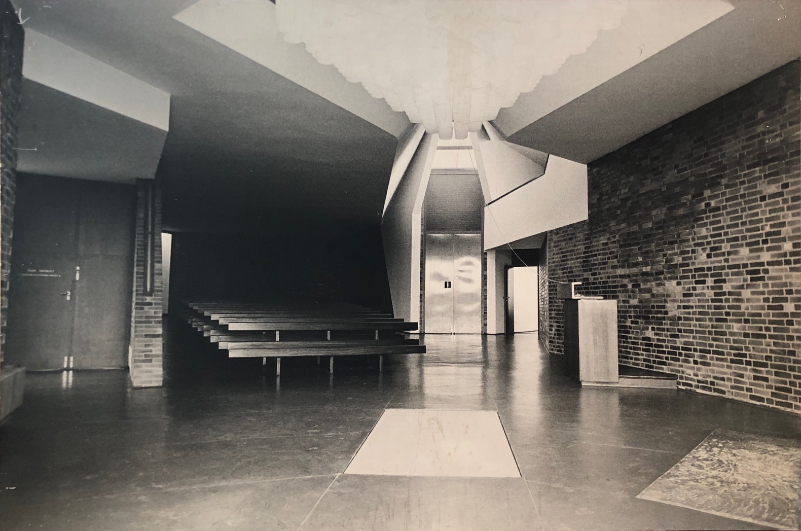 Kapelle des Friedhofs der St. Matthias-Gemeinde (Berlin-Schöneberg). – FEHLING, Hermann (Architekt) / Fehling + Gogel (Architekturbüro): Original-Ausstellungstafel zum Bau eines Kirchengebäudes im Stil der Nachkriegsmoderne. (Fotografische Innenansicht der Kapelle des Friedhofs der St. Matthias-Gemeinde in Berlin-Schöneberg). Berlin/West. [ca. 1980]. Querformat. (ca. 89 x 60 cm). 1 Ausstellungstafel im Großformat. Original-Ausstellungstafel auf festem Träger, dieser mit einer Stärke von etwa 0,4 cm. Befestigungsspuren im Randbereich der Bildfläche, sonst gut erhalten. Altersentsprechend guter Zustand. Der Berliner Architekt Hermann Fehling (1909-1996) zeichnete für viele herausragende Bauten in West-Berlin nach 1945 verantwortlich. So etwa für das Studentendorf Schlachtensee (Gebäudeensemble), das Institut für Hygiene und Mikrobiologie der Freien Universität Berlin und das Max-Planck-Institut für Bildungsforschung, allesamt Beispiele für die sogenannte Nachkriegsmoderne in Deutschland und heutzutage als erhaltenswerte Denkmäler eingestuft. Seit Anfang der 1960er Jahre war Hermann Fehling auch Mitglied der Akademie der Künste (Berlin/West). Hier liegt eine originale Ausstellungstafel zu einem der Gebäude vor die Fehling mit seinem Partner Gogel geschaffen hat. Es handelt sich hier um eine fotografische Ansicht des Innenraums der 1963 gebauten Kapelle des Friedhofs der St. Matthias-Gemeinde in Berlin-Schöneberg, damals Westberlin. Die Ansicht zeigt die moderne Gestaltung des Kircheninnenraumes in schwarz/weiss. Die großformatige Tafel war höchstwahrscheinlich Teil einer Ausstellung des Architekturbüros Fehling + Gogel in den 1980er Jahren. Sie zeigt das architektonische Werk noch im originalen Zustand. Original-Ausstellungstafel aus dem Nachlaß des bedeutenden Architekten Hermann Fehling!