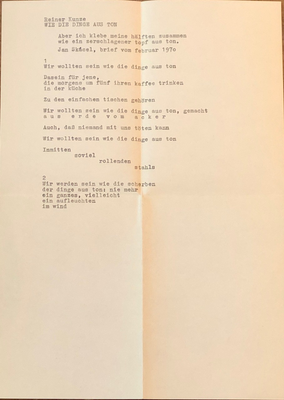 KUNZE, Reiner: WIE DIE DINGE AUS TON. (Original-Typoskript des Autors noch vor Veröffentlichung des Gedichts). Greiz. [1971]. (ca. 29 x 21 cm). 1 Blatt. Original-Typoskript, maschinengeschrieben. Blatt gefaltet, wohlerhalten. Hier liegt ein Original-Typoskript des Autors Reiner Kunze vor, welches dieser im Rahmen eines Briefwechsels an einen befreundeten Theologen in der DDR (dieser war zeitweise Jugendpfarrer) sandte. Das Blatt enthält das mittlerweile berühmte Gedicht „WIE DIE DINGE AUS TON“ das im Gefolge des niedergeschlagenen Prager Frühlings entstanden ist. Es heißt hier eingangs „Wir wollten sein wie die dinge aus ton […]“, im zweiten Teil heißt es dann „Wir werden sein wie die scherben der dinge aus ton: nie mehr ein ganzes […]“. Das Gedicht erschien im Jahr 1972 in Kunzes Gedichtband „zimmerlautstärke“ im Fischer Verlag in der damaligen BRD. Hier liegt das Typoskript vor welches Kunze schon zu Anfang des Jahres 1971 an den befreundeten Jugendpfarrer übersandte und in einem Brief (Juni 1971) später auch erläuterte. Das Typoskript stammt aus dem Nachlaß des Theologen. Original-Gedichttyposkript des beliebten Autors noch vor der Veröffentlichung!