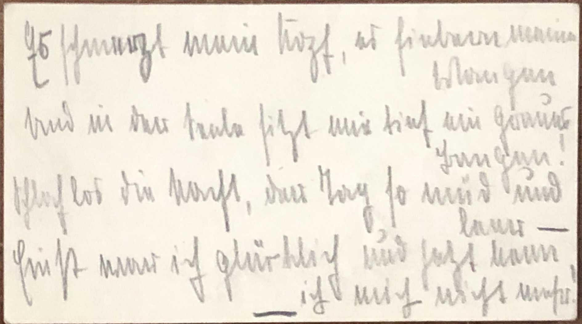 NATHUSIUS, Annemarie von: „Es schmerzt mein Kopf, es fiebern meine Wangen […]“. (Original-Autograph der Schriftstellerin Annemarie von Nathusius mit vier Zeilen). [ca. 1910-1920]. (ca. 6 x 11 cm). 1 Visitenkarte. Original-Visitenkarte, rückseitig beschrieben. Wohlerhalten. Annemarie von Nathusius wurde durch ihr schriftstellerisches Engagement für die Rechte der Frauen im Deutschland der Kaiserzeit wohlbekannt. Sie wird vor allem mit Romanen und Erzählungen assoziiert. Hier liegt aus dem Nachlaß einer einst mit ihr verbundenen Altberliner Familie ein kleiner Autograph vor, der scheinbar ein Gedicht der Schriftstellerin Nathusius enthält. Sie schrieb die vier Zeilen auf der Rückseite ihrer Visitenkarte. Das Gedicht wurde mit Bleistift und in Sütterlin geschrieben. Seine erste Zeile lautet wohl: „Es schmerzt mein Kopf, es fiebern meine Wangen“. Da Annemarie von Nathusius offenbar kaum mit Gedichten an die Öffentlichkeit getreten war bis zu ihrem Tod und auch heute keine Gedichtpublikationen vorliegen, käme dem kleinen Gedicht durchaus eine Bedeutung zu. Kleiner Autograph von literaturgeschichtlichem Wert! ################## LIEBE KUNDEN, WIR MACHEN UNSERE JÄHRLICHE FRÜHLINGSAKTION MIT 30% RABATT AUF DEN GESAMTEN BESTAND. DIE ERMÄSSIGUNG GILT AB SOFORT, DER RABATT WIRD NACH IHRER BESTELLUNG VON DEN PREISEN ABGEZOGEN UND SIE ERHALTEN DEN ENDBETRAG VON UNS. ÜBER IHR INTERESSE AN UNSEREN SELTENEN STÜCKEN WÜRDEN WIR UNS WIE JEDES JAHR SEHR FREUEN ###################