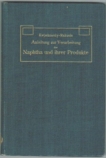 KWIATKOWSKY, N.A. [Kvjatkovskij]: Anleitung zur Verarbeitung der Naphtha und ihrer Produkte. Autorisierte und erweiterte deutsche Ausgabe von M.A. Rakusin. Berlin: Springer. 1904. XII,143(5)S. Original Leinwand mit Rücken- und Deckeltitel. Einband leicht berieben, sonst guter bis sehr guter Zustand.