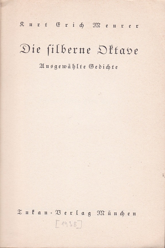 MEURER, Kurt Erich: Die silberne Oktave. Ausgewählte Gedichte. München: Tukan-Verlag. [1938]. 61 S. Original Karton mit montiertem Deckeltitel. Deckeltitel mit 2 kleinen Fleckchen, Kapitale ein wenig bestoßen, oben leicht gestaucht, sonst in gutem Zustand. Erstausgabe. – Raabe 206.9 –