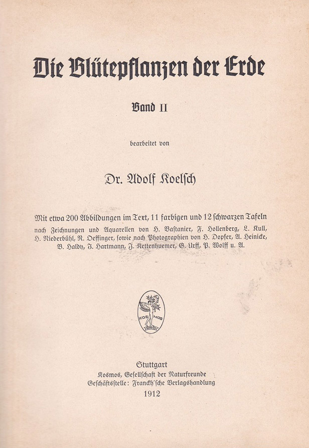 FRANCÉ, R.H.: Die Blütenpflanzen der Erde (einschließlich der Farne). In 2 Bänden. Stuttgart: Kosmos, Franckh. 1911. 4°. VIII,544; VIII, 604 S. Original Leinwand mit goldgeprägtem Rückentitel und blindgeprägter Deckel-Vignette. Einband leicht berieben, gut erhalten. Mit ca. 400 Textabbildungen und 45 teils farbigen Tafeln. Band 2 bearbeitet von Adolf KOELSCH. ################## LIEBE KUNDEN, WIR MACHEN UNSERE JÄHRLICHE FRÜHLINGSAKTION MIT 30% RABATT AUF DEN GESAMTEN BESTAND. DIE ERMÄSSIGUNG GILT AB SOFORT, DER RABATT WIRD NACH IHRER BESTELLUNG VON DEN PREISEN ABGEZOGEN UND SIE ERHALTEN DEN ENDBETRAG VON UNS. ÜBER IHR INTERESSE AN UNSEREN SELTENEN STÜCKEN WÜRDEN WIR UNS WIE JEDES JAHR SEHR FREUEN ###################