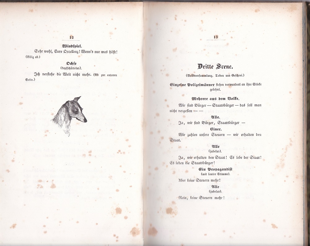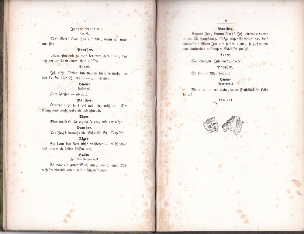 BAUERNFELD, [Eduard von]: Die Republik der Thiere. Phantastisches Drama sammt Epilog. (Geschrieben im April 1848). [Ohne Tafeln!]. Wien: L.W.Seidel. 1848. 95 S. Schlichtes Halbleinen mit Rückentitel. Einband bestoßen, Name auf Vorsatz, durchgängig stockfleckig, insgesamt ordentlicher Zustand. Erstausgabe. WG2.19. – Es fehlen die 7 Zinkätzungen von J.M.Ranftl! – Am Ende jeder Szene eine Tier-Vignette.