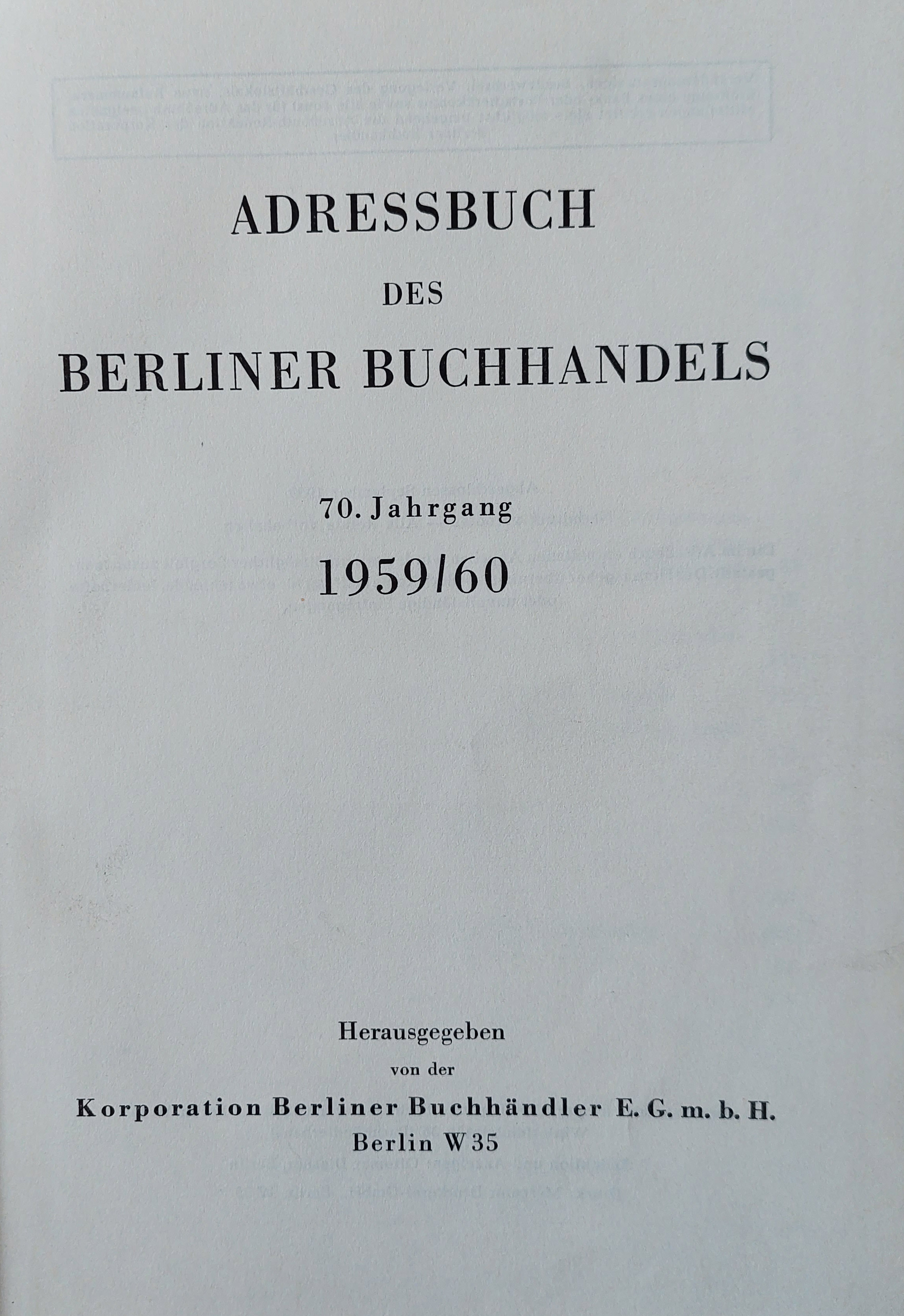 KORPORATION BERLINER BUCHHÄNDLER: Adressbuch des Berliner Buchhandels 70.Jahrgang 1959/60 Abgeschlossen September 1959. Berliner Buchhändler. Berlin: Verl.Korporation Berliner Buchhändler. 1959 208 S. Original Leinwand mit geprägtem Deckel- und Rückentitel, Lesebändchen. Einband leicht berieben, sonst gut erhalten. ######################## LIEBE KUNDEN, WIR MACHEN UNSERE JÄHRLICHE WEIHNACHTSAKTION MIT VOLLEN 30% RABATT AUF DEN GESAMTEN BESTAND UND FREUEN UNS AUF IHR INTERESSE. (Die Ermäßigung ist nun bereits im angezeigten Preis enthalten) #########################