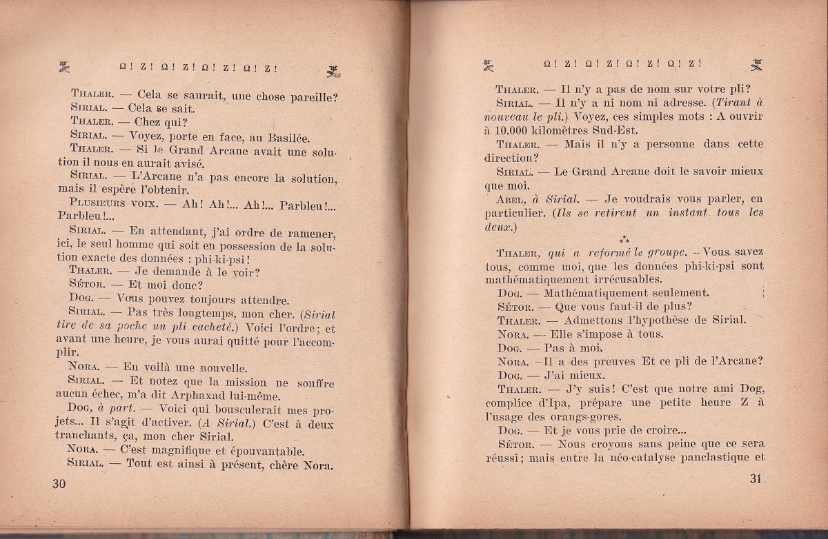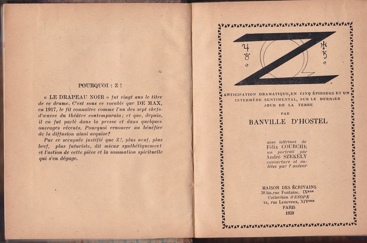 BANVILLE D’HOSTEL, Lucien: Z. Anticipation dramatique, en cinq épisodes et un intermède sentimental sur le dernier jour de la terre. (signed!). Paris: Maison de Écrivains, Collection d’Esope. 1929. 153, (6) p. Self-made half cloth (private binding by Friedrich Rasenberger-Koch, with exlibris). Slightly worn, with some staining to end-papers, inside with natural browning. Good condition. Signed by Banville d’Hostel und dedicated to Friedrich Rasenberger-Koch.