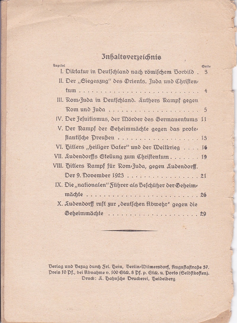 WELLINGHUSEN: Rom-Juda, das Verhängnis der Deutschen. Ein Weckruf! Berlin: Hein. 1930. (ca. 21 x 14,5 cm). 32 S. Original-Broschur mit Deckeltitel. Einband etwas berieben, kleiner Einriß oben, sonst gut erhalten. Erste Ausgabe. – Aus dem Inhalt: Diktatur in Deutschland nach römischem Vorbild. – Rom-Juda in Deutschland. Luthers Kampf gegen Rom und Juda. – Hitlers „heiliger Vater“ und der Weltkrieg. – Ludendorffs Stellung zum Christentum. – Die „nationalen“ Führer als Beschützer der Geheimmächte. – und anderes, wohl aus dem Ludendorff-Umfeld.