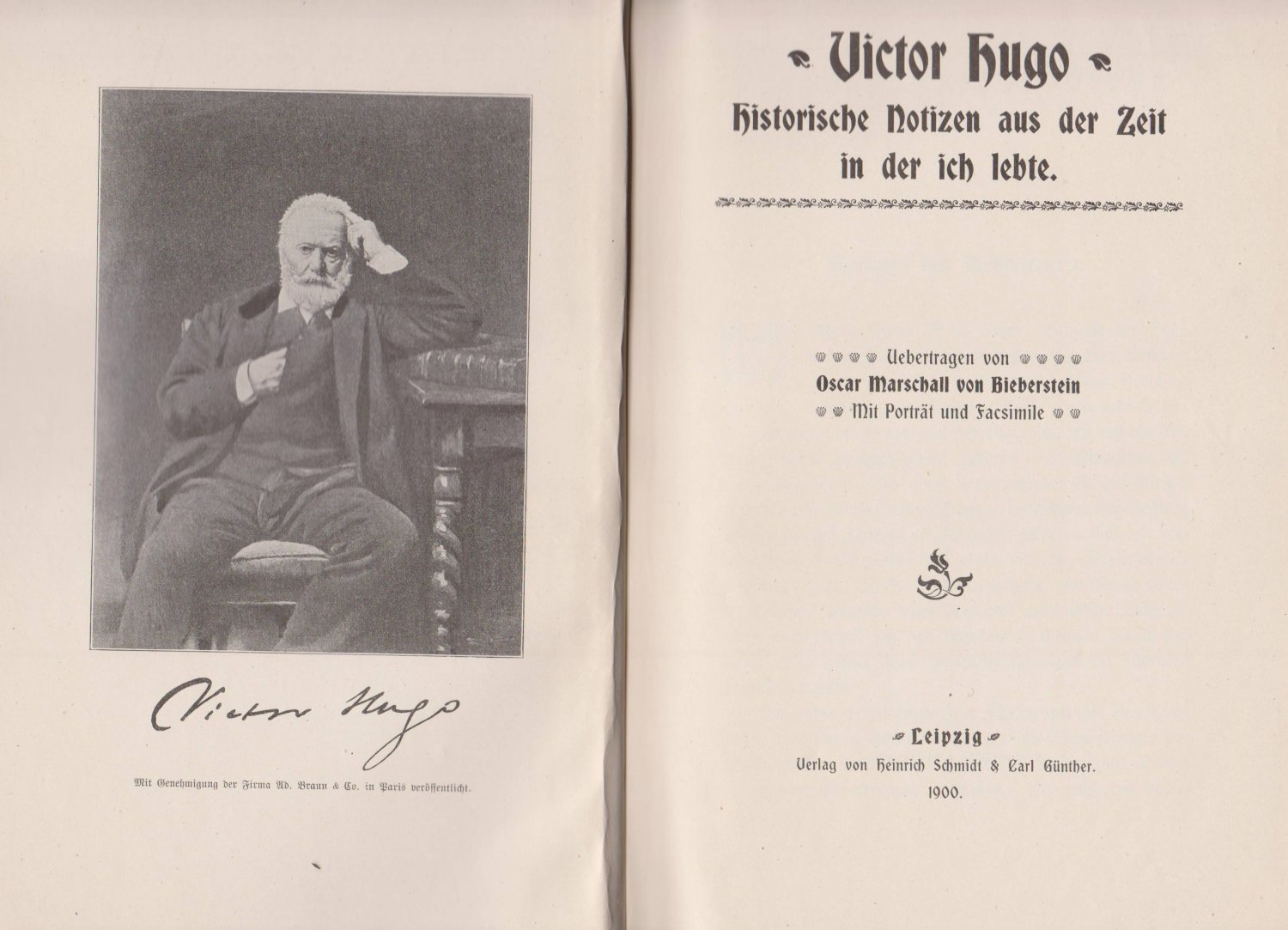 HUGO, Victor: Historische Notizen aus der Zeit in der ich lebte. Uebertragen von Oscar Marschall von Bieberstein. Mit Porträt und Facsimile. Leipzig: Verlag von Heinrich Schmidt & Carl Günther. 1900. 4°. (24 x 16,7 cm). 264 S. (Fraktur). Original-Halbleinen mit Rücken- und Deckeltitel. Einband an den Kanten etwas berieben, Leinen leicht fleckig und gebräunt. Privates Exlibris auf dem Innendeckel, sonst wohlerhalten. Altersentsprechend guter Zustand.