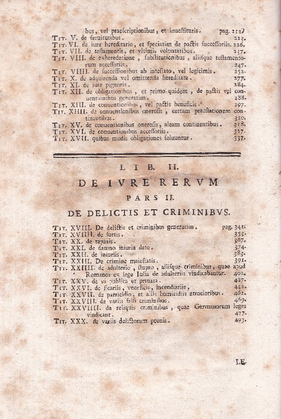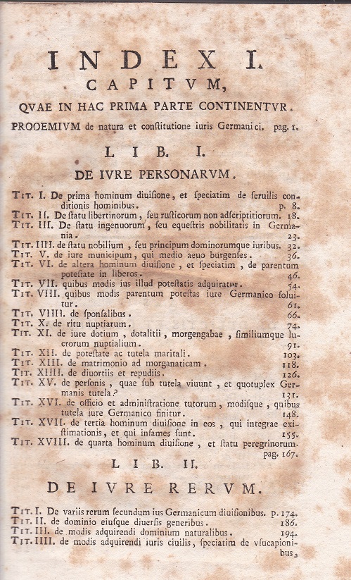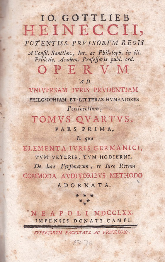 [HEINECCIUS, Johann Gottlieb], hier: HEINECCII, Io. Gottlieb: Io. Gottlieb Heineccii … Operum ad vniversam ivris prvdentiam philosophiam et litteras hvmaniores pertinentium, tomvs quartvs, pars prima, in qua elementa ivris germanici, tvm veteris, tvm hodierni, de iure personarum, et iure rerum commoda avditoribvs methodo adornata. 4. Band, 1. Teil. Neapel: Impensis Donati Campi. 1770. Gr. 8°. (ca. 25 x 20 cm). [4], XXXXII, 505 (i.e. 503) S. Ganzpergament der Zeit mit goldgeprägtem Rückenschilchen. Deckel wenig berieben, innen durchgängig stockfleckig, im Vorsatz in der Bugfalte Wurmgänge, sonst allgemein gut erhalten.