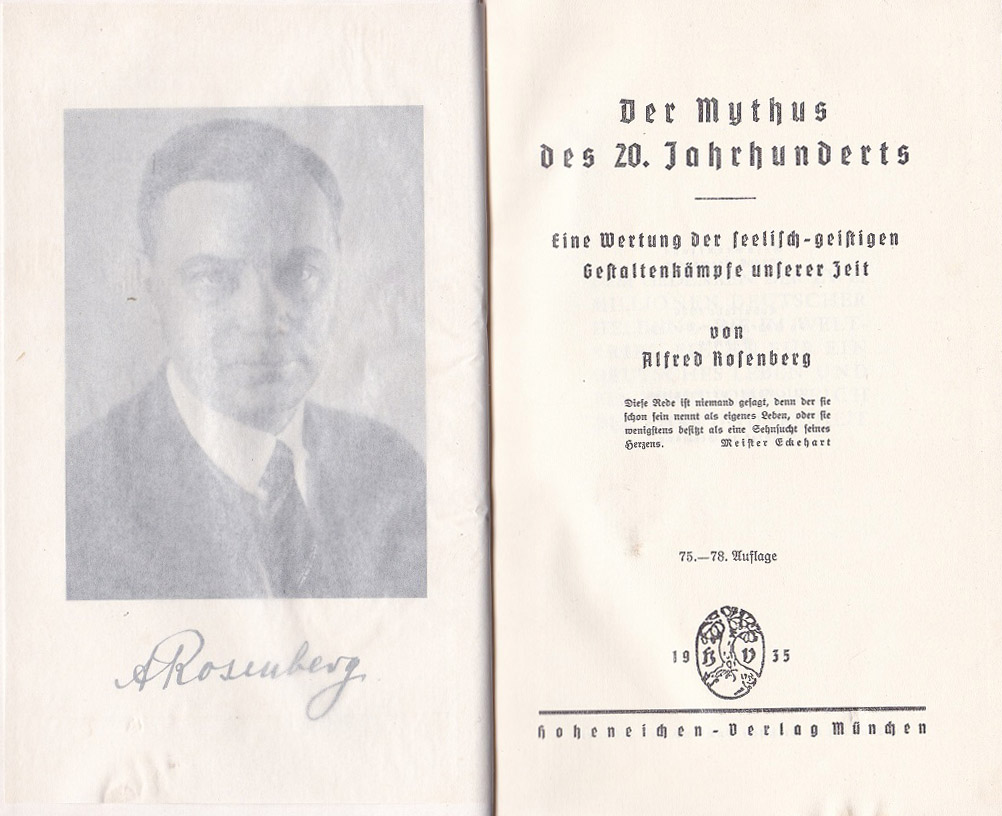 ROSENBERG, Alfred: Der Mythus des 20. Jahrhunderts. (Mit gut erhaltenem Original-Schutzumschlag!) Eine Wertung der seelisch-geistigen Gestaltungskämpfe unserer Zeit. 75.-78. Auflage. München: Hoheneichen-Verlag. 1935. (ca. 19 x 13,5 cm). XXI, 712 S. Original-Leinen mit Rücken- und Deckeltitel, Original-Umschlag mit Rückentitel und illustriertem Deckeltitel. Umschlag minimal gerändert, Schnitt ein wenig stockfleckig, private Widmung auf dem Vortitel, sonst innen tadellos und anscheinend ungelesen. Altersentsprechend sehr guter Zustand. Mit 1 Frontispiz-Porträt, Sach- und Namensverzeichnis.