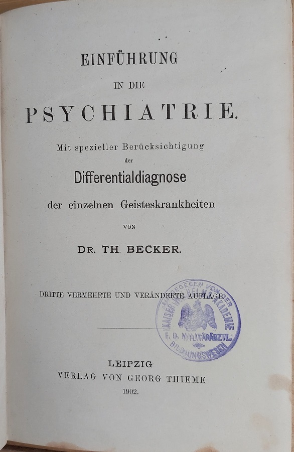 BECKER, Th: Einführung in die Psychiatrie. Mit spezieller Berücksichtigung der Differentialdiagnose der einzelnen Geisteskrankheiten. Dritte vermehrte und veränderte Auflage. Leipzig: Thieme. 1902. ca. 19 x 13 cm. 166 Text, (9) Verlagswerbung S. Original-Leinwand mit goldgeprägtem Rücken- und Deckeltitel. Einband leicht berieben. Bindung etwas locker. Papier auf fliegendem Vorsatz etwas fleckig . Einstichstelle über mehrere Seiten am unteren Papierrand ohne Auswirkung auf den Text. Vereinzelt Anstreichungen. Ehemaliges Exemplar der Kaiser Wilhelm-Akademie altgestempelt. Sonst guter Zustand. ######################## LIEBE KUNDEN, WIR MACHEN UNSERE JÄHRLICHE WEIHNACHTSAKTION MIT VOLLEN 30% RABATT AUF DEN GESAMTEN BESTAND UND FREUEN UNS AUF IHR INTERESSE. (Die Ermäßigung ist nun bereits im angezeigten Preis enthalten) #########################