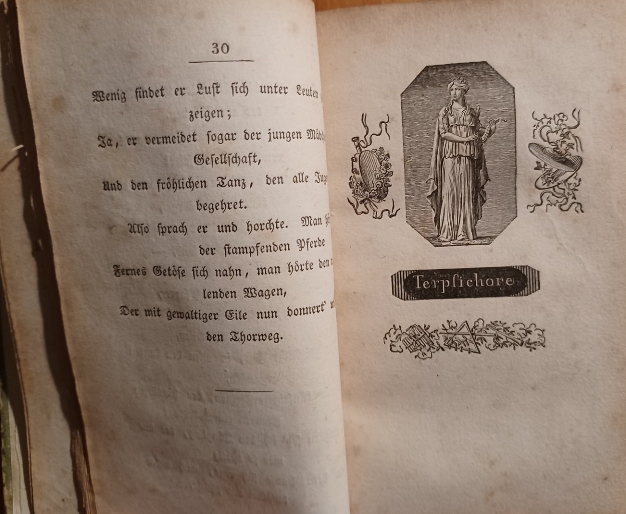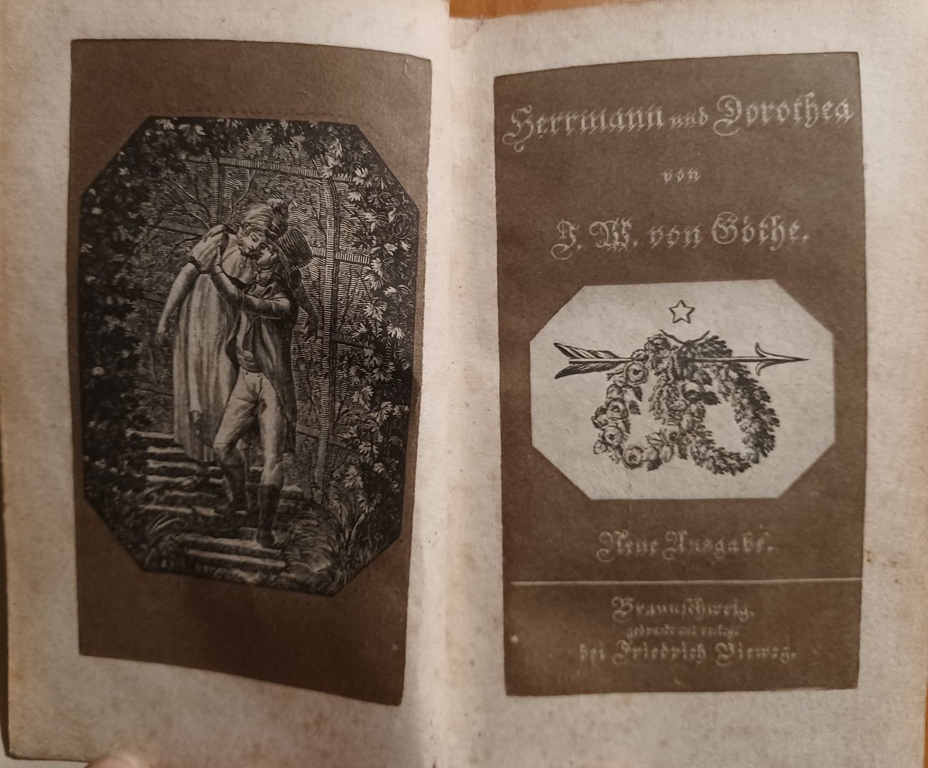 GOETHE, J.W.: Hermann und Dorothea. Neue Auflage. Braunschweig. Vieweg. [ca. 1840]. ca. 13 x 8 cm. 221 S. Schlichter Papp-Einband der Zeit. Einband berieben. Papier stockfleckig. Innenscharnier an einer Stelle repariert, sonst guter Zustand. Mit 2 zweifarbigen Kupfertondrucktafeln als Titel und Frontispiz. Mit weiteren 8 Kupferstichtafeln.
