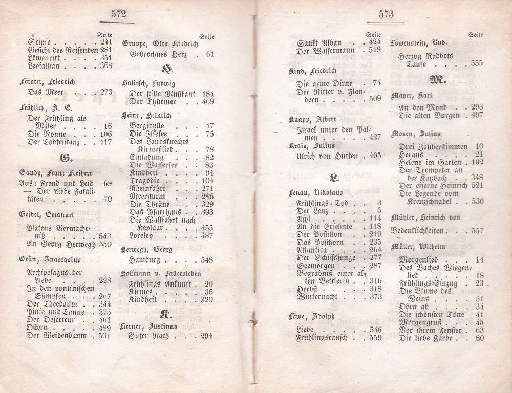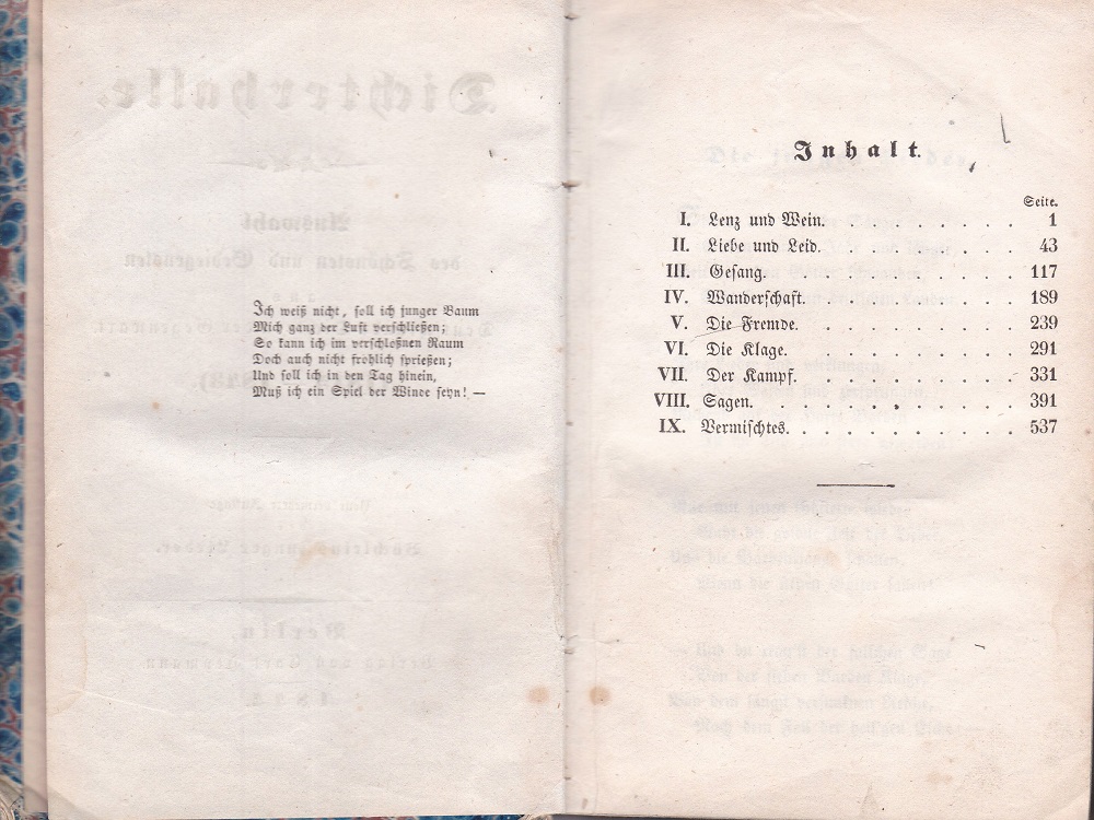 Dichterhalle. Auswahl des Schönsten und Gediegensten aus Deutschlands Dichtern der Gegenwart (1815-1843). Neue vermehrte Auflage des Büchleins junger Lieder. Berlin: Heymann. 1844. Kl.8°. IV,576 S. Marmorierter Pappband der Zeit mit handschriftlichem Rückenschildchen. Einband berieben und bestoßen, Rückenschildchen mit Eckverlust. Innen papierbedingt unterschiedlich gegilbt, kaum stockfleckig, gut erhalten. Mit einem einleitenden Gedicht des Herausgebers und Register am Schluß. Enthält, geordnet nach Themengebieten, zahlreiche Gedichte namhafter Lyriker wie Lenau, Uhland, W. Müller, Fallersleben, Rückert, Heine, F. Freiherr v. Gaudy, Kind, Chamisso, R. Reinick, W. Wackernagel, A. v. Arnim, F. Freiligrath, Eichendorff, J. Kerner, A. Grün, A. Graf v. Platen, J. Rotter, J. Chr. v. Zedlitz etc.