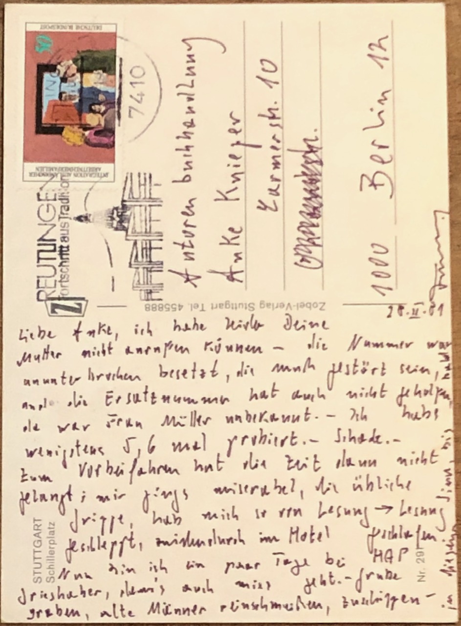 FÜHMANN, Franz: Postkarte mit Autograph und Signatur des Autors nach Westberlin. (Original-Postkarte während eines Aufenthalts bei HAP Grieshaber). 1981. (ca. 10,4 x 14,8 cm). 1 Karte. Postkarte mit fotografischer Abbildung, rückseitig handschriftlich beschrieben und signiert. Karte mit Briefmarke (BRD) und gelaufen. Insgesamt guter Zustand. Die Postkarte zeigt auf der Vorderseite eine fotografische Abbildung aus Stuttgart. Fühmann schrieb diese Karte wohl von einem Aufenthalt in der BRD und während eines Besuchs bei HAP Grieshaber. Sie ist datiert auf den 28. Februar 1982 und ist für eine Postkarte überaus dicht beschrieben. Die Karte sandte er an die ihm sehr verbundene Buchhändlerin aus der einstigen Autorenbuchhandlung in Westberlin (Carmerstraße, Berlin-Charlottenburg), welche dem DDR-Autor Anlaufstelle für viele seiner Aktivitäten in Westberlin und der BRD gewesen war. Er schrieb ihr in der originellen Karte unter anderem: „[…] mir gings miserabel, die übliche Grippe, hab mich so von Lesung zu Lesung geschleppt, zwischendurch im Hotel geschlafen. Nun bin ich ein paar Tage bei HAP Grieshaber, dem’s auch mies geht – Grube graben, alte Männer reinschmeißen, zuschippen – in diesem Sinn, bis bald Franz“. Die signierte Karte stammt aus dem Nachlaß jener Lieblingsbuchhändlerin in Westberlin, mit welcher er bis kurz vor seinem Tod in enger Verbindung stand. Die Karte wurde von Fühmann mit Vornamen signiert. Original-Schriftstück des bedeutenden Autors aus der DDR!