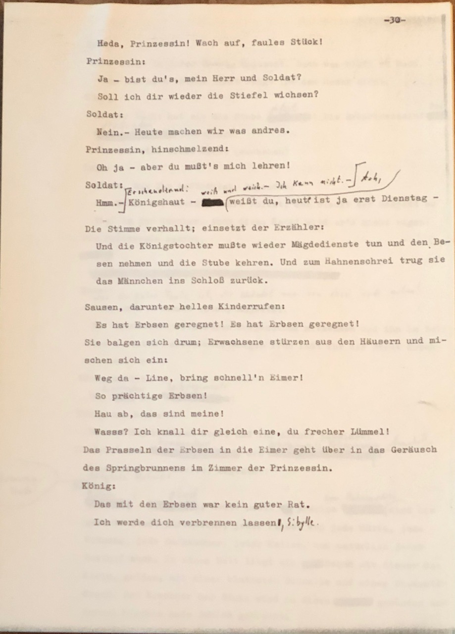FÜHMANN, Franz: Das Blaue Licht. Hörspiel für Erwachsene nach dem Märchen der Brüder Grimm. (Manuskriptfassung mit handschriftlichen Anmerkungen des Autors, zeitgenössische Kopie). Berlin/DDR. [1984]. (ca. 29,7 x 21 cm). 63 Blatt. Manuskript, maschinengeschrieben, mit zahlreichen handschriftlichen Anmerkungen. Zeitgenössische Kopie. Papier etwas gebräunt, sonst gut erhalten. Fühmanns Hörspiel „Das Blaue Licht“ wurde erst 1986 im Rundfunk der DDR gesendet, und erst 1988 ist es in einem Sammelband im Henschel Verlag erschienen. Hier handelt es sich um eine Manuskriptfassung Fühmanns aus dem Jahr 1984. Das maschinengeschriebene Manuskript enthält insgesamt 63 Blatt samt handschriftlichen Anmerkungen Fühmanns. Es handelt sich hierbei um Streichungen und handschriftliche Einfügungen und Alternativen, nahezu jede Seite weist diese auf. Die Seiten haben auch eine noch im Prozess stehende und daher abweichende Numerierung Fühmanns, die Seite 7 etwa gibt es mit 7a-7d gleich mehrfach. Das Manuskript liegt in einer zeitgenössischen Kopie vor. Diese Kopie übergab Fühmann kurz vor seinem Tod im Sommer 1984 zusammen mit anderen Papieren an eine ihm sehr verbundene Buchhändlerin in Westberlin, vermutlich als Sicherung seiner noch unpublizierten Texte für den bereits nahenden Fall seines Ablebens. Diese Buchhändlerin war Mitarbeiterin der für Franz Fühmanns Aktivitäten in Westberlin und der damaligen BRD sehr wichtigen Autorenbuchhandlung in Westberlin (Carmerstraße, Berlin-Charlottenburg). Die vorliegende Manuskript-Kopie, die über den später veröffentlichten Text durch ihr Offenlegen des vorgängigen Bearbeitungsprozesses durch den Autor hinausgeht, entstammt dem Nachlaß von jener Lieblingsbuchhändlerin Fühmanns.