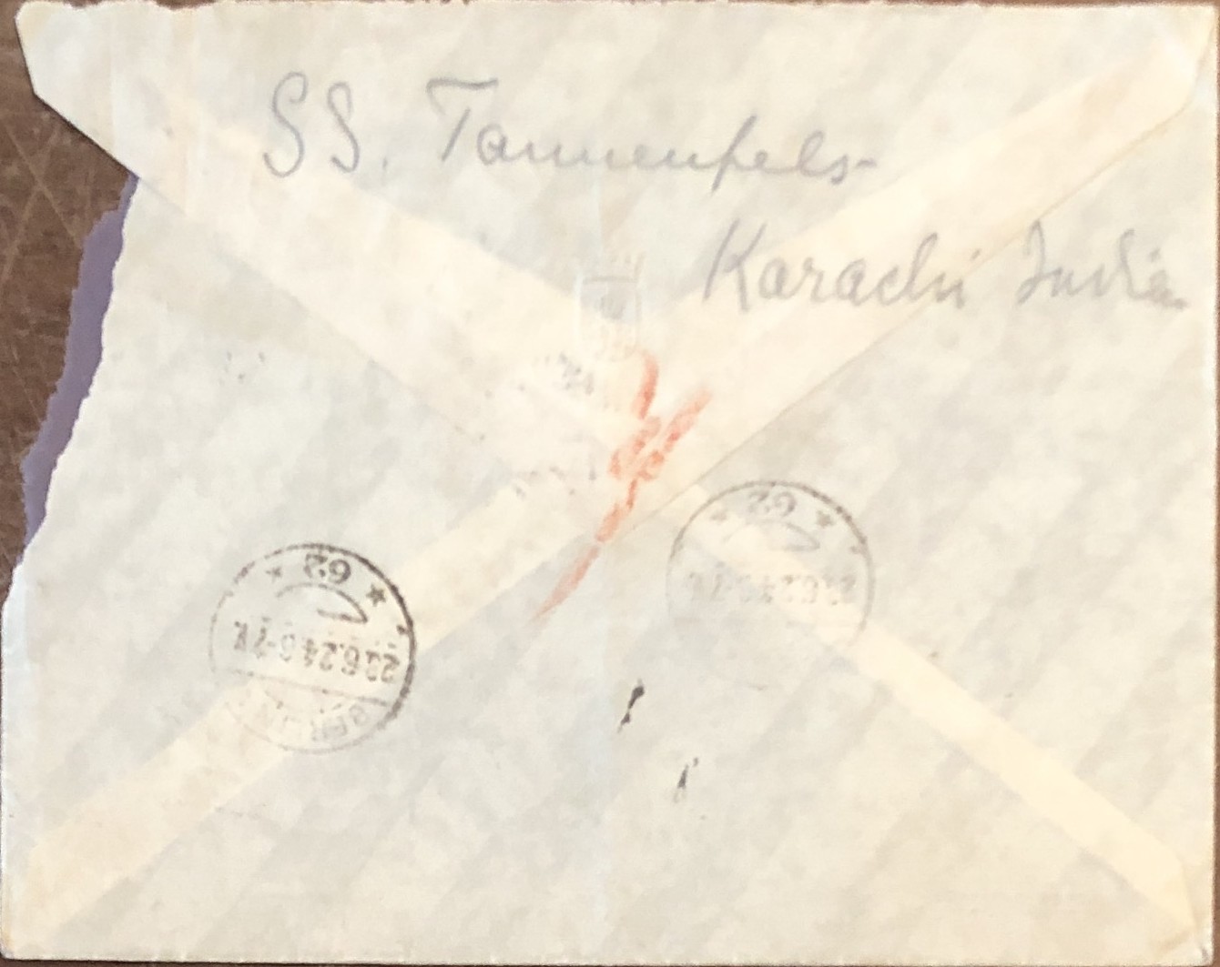 (Persienreise 1924-1925). – NATHUSIUS, Annemarie von: „Meine liebe Frau Rausch“, handschriftlicher Brief an Bord der Tannenfels, datiert auf 20.06.1924. (Original-Brief der Autorin, geschrieben von ihrer großen Persienreise 1924-1925). 1924. (ca. 28 x 22 cm). 2 Seiten. Mit Original-Briefumschlag, dieser gestempelt. Original-Brief, zweiseitig, überaus dicht mit Bleistift beschrieben. Papier gefaltet, Kuvert mit Abriß, wohlerhalten. Die Autorin Annemarie von Nathusius war durch ihr schriftstellerisches Engagement für die Rechte der Frauen im Deutschland der Kaiserzeit wohlbekannt. Sie hat im Jahr 1924 eine große Persienreise angetreten und ist dort sogar mit einem Automobil gereist, was zumal für eine Frau damals alles andere als gewöhnlich war. Sicher war dies auch eines ihrer Ziele, eben sichtbar als Frau eine derartige Reise zu unternehmen und über ihre Erfahrungen publizistisch zu berichten, wie in einzelnen Zeitungsartikeln auch geschehen. Im Jahr ihrer Rückkehr nach Berlin, 1925, ist sie plötzlich verstorben. Annemarie von Nathusius hat auf ihrer großen Reise im Orient geschrieben und korrespondiert, so auch mit einer ihr verbundenen Berliner Familie. Hier liegt ein Stück aus dieser ganz besonderen Korrespondenz vor, welches im Nachlass jener Altberliner Familie erhalten geblieben ist. Der Brief ist auf zwei Seiten dicht beschrieben, er umfasst etwa 40 Zeilen. Im Briefkopf wurde er auf den 20. Juni 1924 datiert. Auch hat die Autorin dort angegeben daß der Brief „an Bord der Tannenfels“ geschrieben wurde, sehr wahrscheinlich das Schiff ihrer Überfahrt. Im Brieftext ist dann vielfach von Reisedetails die Rede, so wird etwa der Ort „Bushir“ (heute in Iran) gleich mehrere Male von ihr erwähnt, da dieser vermutlich eines ihrer Reiseziele gewesen ist. Der Brief wurde von ihr mit „A v N“ signiert. Sowohl das Briefpapier als auch der ebenfalls erhaltene Originalumschlag enthalten ein geprägtes Wappen, wohl das Familienwappen der Baronin von Nathusius. Der Umschlag enthält rückseitig den Absender „SS. Tannenfels – Karachi Indien“. Vermutlich hat das Schiff dort angelegt oder hatte Indien als Ziel der Überfahrt, gestempelt wurde er mit Datum 23.06.1924. Ein gleich mehrfach beeindruckendes Stück von einer einst berühmten deutschen Schriftstellerin im Einsatz für die gesellschaftliche Position der Frauen und von einer zeitgenössisch höchst ungewöhnlichen Reise bis nach Persien. Ein literaturgeschichtliches Unikat!