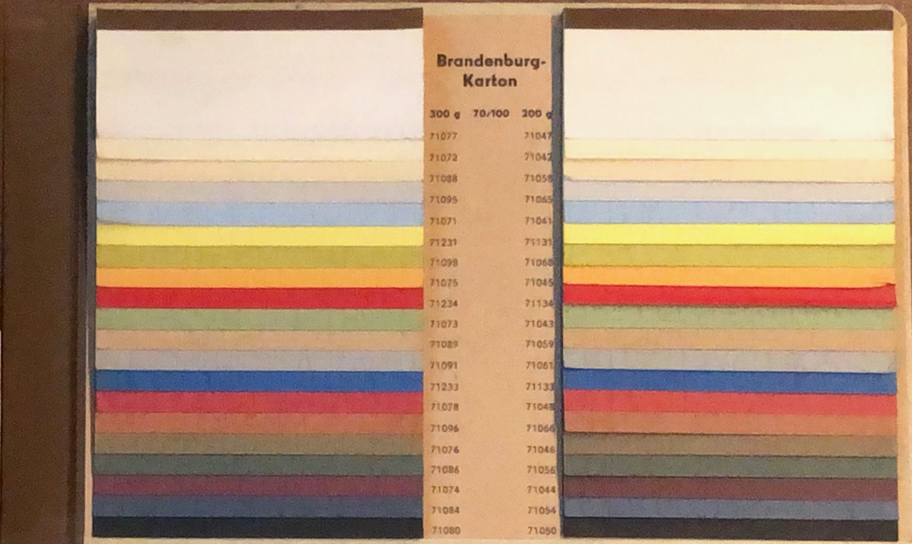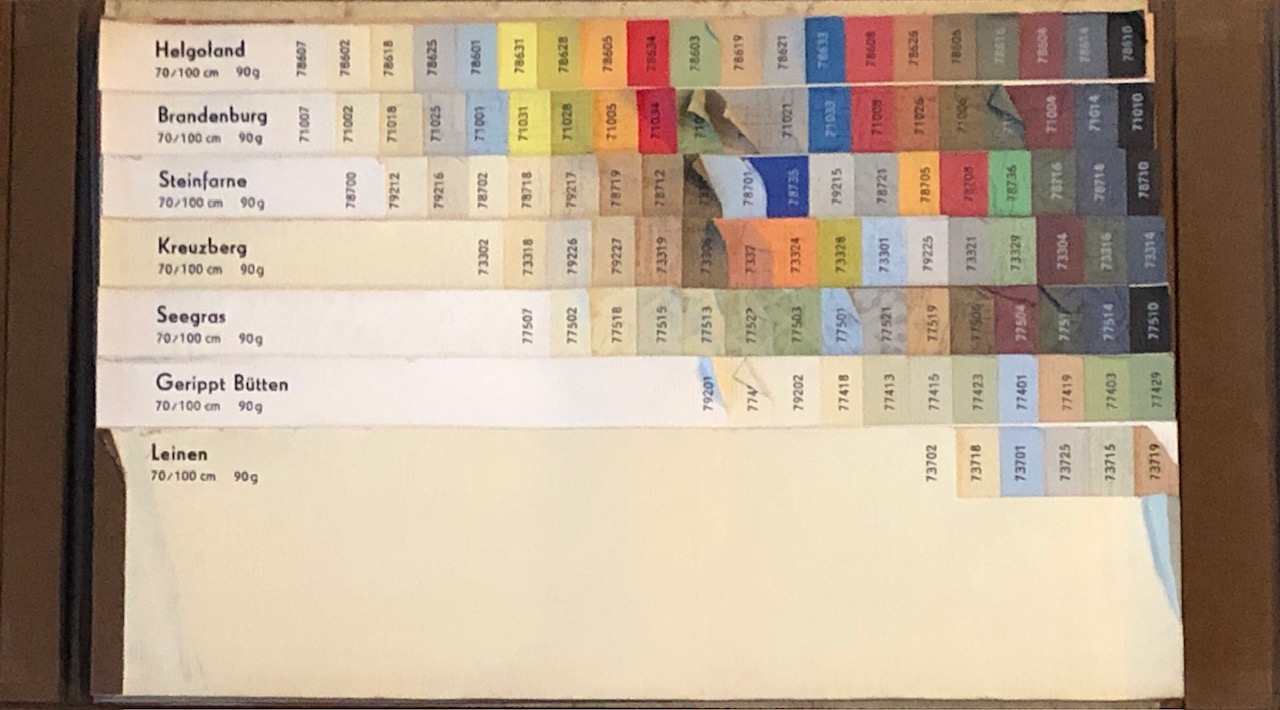WILH. VALENTIN KG (Berlin/West): Bezugpapier – Umschlagkarton. Musterbuch, Januar 1959. (Firmenkatalog mit zahlreichen Mustern für Papiere und Karton). Berlin/West: Wilh. Valentin. 1959. (ca. 18,5 x 28 cm). Halbleinen-Einband zum Aufklappen, Titel auf Rücken und Deckel. Leichte Gebrauchsspuren, gut erhalten. Der umfangreiche Katalog enthält im Inneren zahlreiche Muster für Bezugpapiere und Umschlagkarton, beide jeweils in vielen Farb-Varianten. Montiert ist auch die Preisliste aus dem Jahr 1959. Musterbuch der einstigen Westberliner Firma Wilh. Valentin. ################## LIEBE KUNDEN, WIR MACHEN UNSERE JÄHRLICHE FRÜHLINGSAKTION MIT 30% RABATT AUF DEN GESAMTEN BESTAND. DIE ERMÄSSIGUNG GILT AB SOFORT, DER RABATT WIRD NACH IHRER BESTELLUNG VON DEN PREISEN ABGEZOGEN UND SIE ERHALTEN DEN ENDBETRAG VON UNS. ÜBER IHR INTERESSE AN UNSEREN SELTENEN STÜCKEN WÜRDEN WIR UNS WIE JEDES JAHR SEHR FREUEN ###################