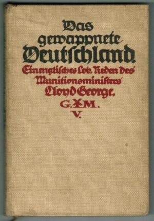GEORGE, Lloyd: Das gewappnete Deutschland. Ein englisches Lob. Reden des Munitionsministers Lloyd George. München, Berlin: Georg Müller. 1916. 127 S. Original Leinwand mit Rücken- und Deckeltitel, Lesebändchen. Einband etwas berieben und fleckig, untere Ecken ein wenig gestaucht, montiertes Exlibris auf Vorsatz, einige wenige Seiten etwas stockfleckig, S. 46-51 jeweils mit einem leichten Fleck im Randbereich, sonst guter Zustand.