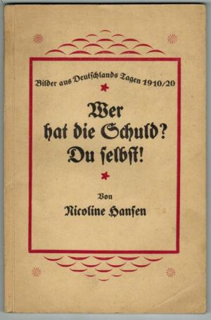 HANSEN, Nicoline: Wer hat die Schuld? Du selbst! Bilder aus Deutschlands Tagen 1910 – 1920. 2. Auflage. Schwerin i. Mecklg.: Bahn. 1923. 103 S. Original Karton mit Deckeltitel. Einband leicht berieben, Schnitt ein wenig fleckig, eingangs leichte Fingerspuren, sonst in gutem Zustand. Mit einem Vorwort der Verfasserin .