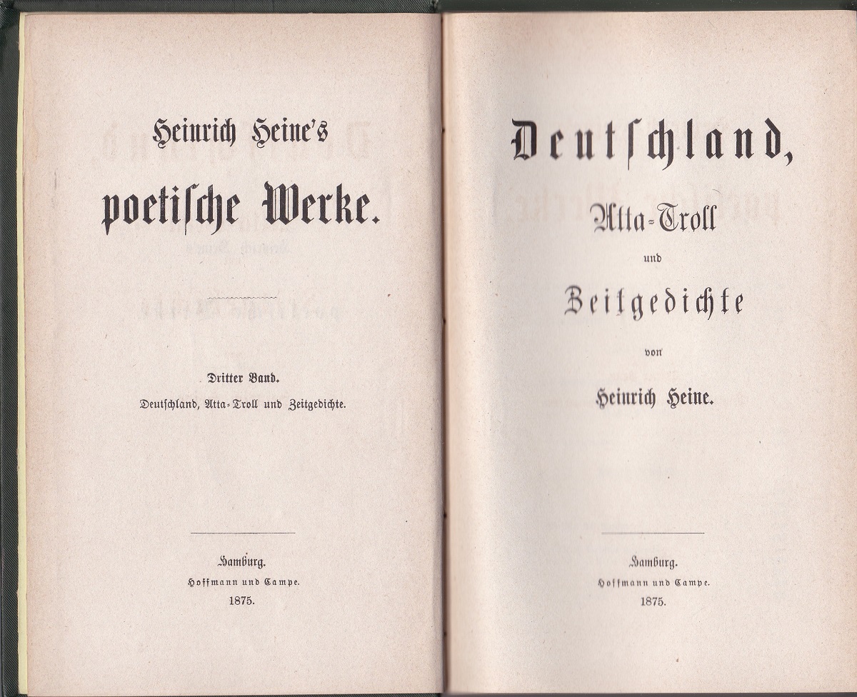 HEINE, Heinrich: Heinrich Heine’s poetische Werke. (4 Teile in 2 Bänden). Hamburg: Hoffmann und Campe. 1875. Kl.8°. XXIII,334,XV,287;VI,(1),263,XII,399 S. Grüne Leinenbände mit gold und schwarz geprägtem ornamental verziertem Rücken- und Deckeltitel, marmorierter Schnitt. Kanten etwas berieben, Band 2: oberes Kapital geklebt. Bei beiden Bänden vorderes Vorsatzscharnier angebrochen, sonst innen sehr guter Zustand.