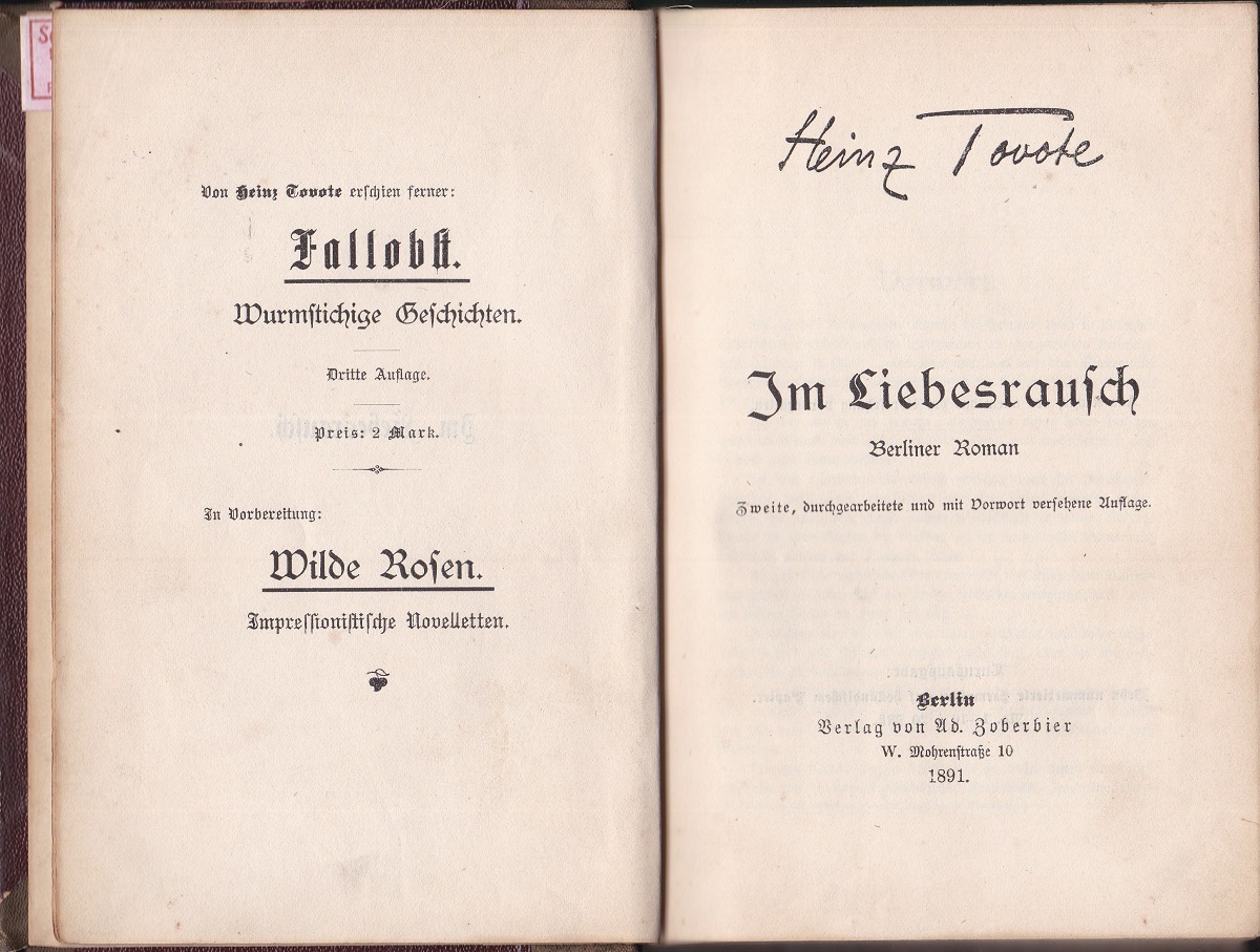 TOVOTE, Heinz: Im Liebesrausch. Berliner Roman. Zweite, durchgearbeitete und mit Vorwort versehene Auflage. Berlin: Zoberbier. 1891. Kl.8°. XIII,392 S. (Fraktur). Schlichte Halbleinwand der Zeit. Einband berieben, Kanten beschabt und Ecken etwas gestaucht, Bindung ein wenig gelockert. Montiertes Händlerschildchen auf Vorsatz vorn, durchgehend mit leichten bis mittleren Fingerspuren, sonst in Ordnung. Zum Autor (* 12. April 1864 in Hannover; † 4. Februar 1946 in Berlin) siehe Wikipedia.