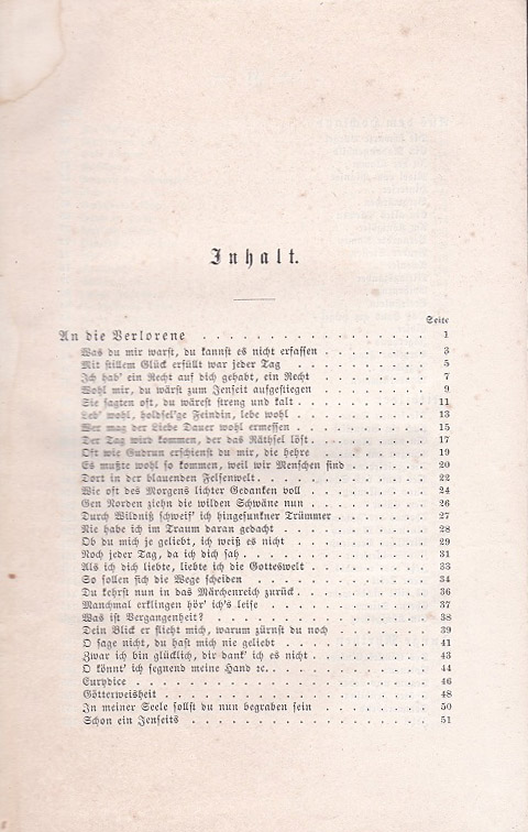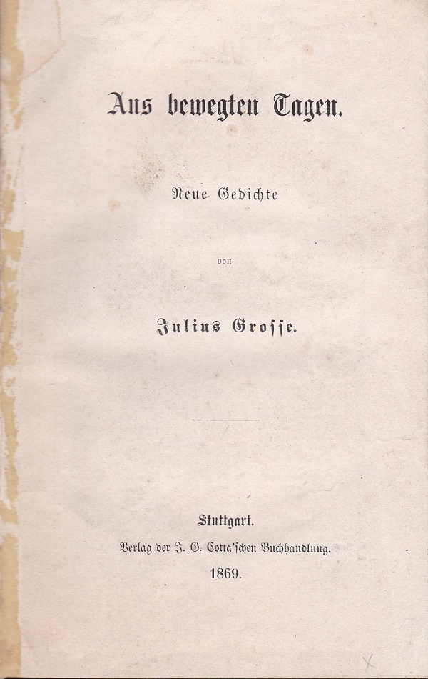 GROSSE, Julius: Aus bewegten Tagen. Neue Gedichte. Stuttgart: Cotta. 1869 VIII,328 S. Schlichtes Halbleinen der Zeit mit handschriftlichem Papier-Rückenschildchen. Etwas berieben und bestoßen. Iinnen teils leicht stockfleckig, insgesamt ordentlich. Erstausgabe. WG 2.15. – ######################## LIEBE KUNDEN, WIR MACHEN UNSERE JÄHRLICHE WEIHNACHTSAKTION MIT VOLLEN 30% RABATT AUF DEN GESAMTEN BESTAND UND FREUEN UNS AUF IHR INTERESSE. (Die Ermäßigung ist nun bereits im angezeigten Preis enthalten) #########################