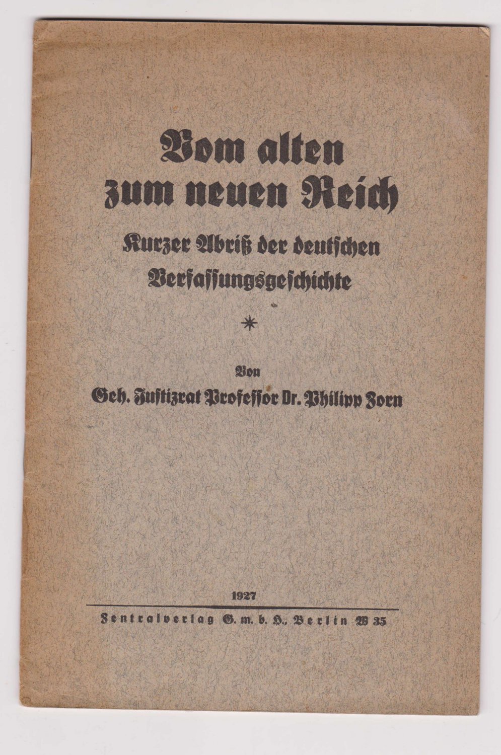 ZORN, Philipp: Vom alten zum neuen Reich. Kurzer Abriß der deutschen Verfassungsgeschichte. Berlin: Zentralverlag 1927 Gr.8° (24 cm x 15,5) 20 S. Original-Karton mit Deckeltitel. Rückenfalz teils gebrochen. Einband an den Rändern gebräunt. Innen guter Zustand. ################## LIEBE KUNDEN, WIR MACHEN UNSERE JÄHRLICHE FRÜHLINGSAKTION MIT 30% RABATT AUF DEN GESAMTEN BESTAND. DIE ERMÄSSIGUNG GILT AB SOFORT, DIE PREISE SIND BEREITS REDUZIERT. ÜBER IHR INTERESSE AN UNSEREN SELTENEN STÜCKEN WÜRDEN WIR UNS WIE JEDES JAHR SEHR FREUEN ###################