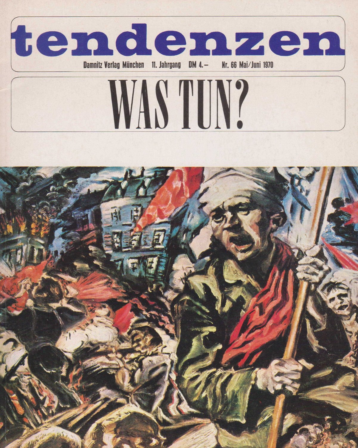 BÜCKING, Bernd / Hiepe, R. (Redaktionskollegium): Tendenzen. Nr. 66, Mai/Juni 1970. Zeitschrift für demokratische Kunst. Hefttitel: Was tun? München: Damnitz Verlag. 1970. 4°. (25,9 x 21 cm). 42 S. Original-Broschur mit illustriertem Deckeltitel. Einband mit leichten Gebrauchsspuren, sonst wohlerhalten. Insgesamt guter Zustand. (= Tendenzen, Nr. 66, 11. Jahrgang). Die Ausgabe enthält zahlreiche Abbildungen (schwarz/weiss) von Künstlern wie Johannes Grützke, Giacomo Manzu, Equipo Cronica, Christoph Voll, Renato Guttuso, Günther Knipp und anderen.