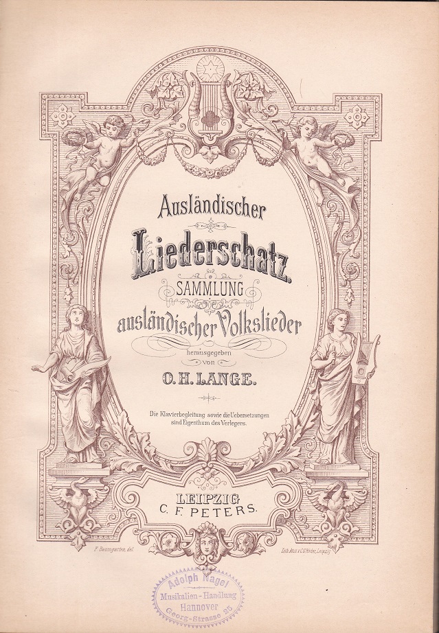 LANGE, O. H. (Herausgeber): Ausländischer Liederschatz. Sammlung ausländischer Volkslieder. Leipzig: C. F. Peters. [ca. 1900]. 4°. (27,4 x 20,1 cm). 114 S. Original-Leinen mit goldgeprägtem illustriertem Deckeltitel. Einband an Ecken und Kanten etwas berieben. Kleiner Eigentumsstempel auf dem Titelblatt unten, sonst wohlerhalten. Altersentsprechend guter Zustand. (= Edition Peters)