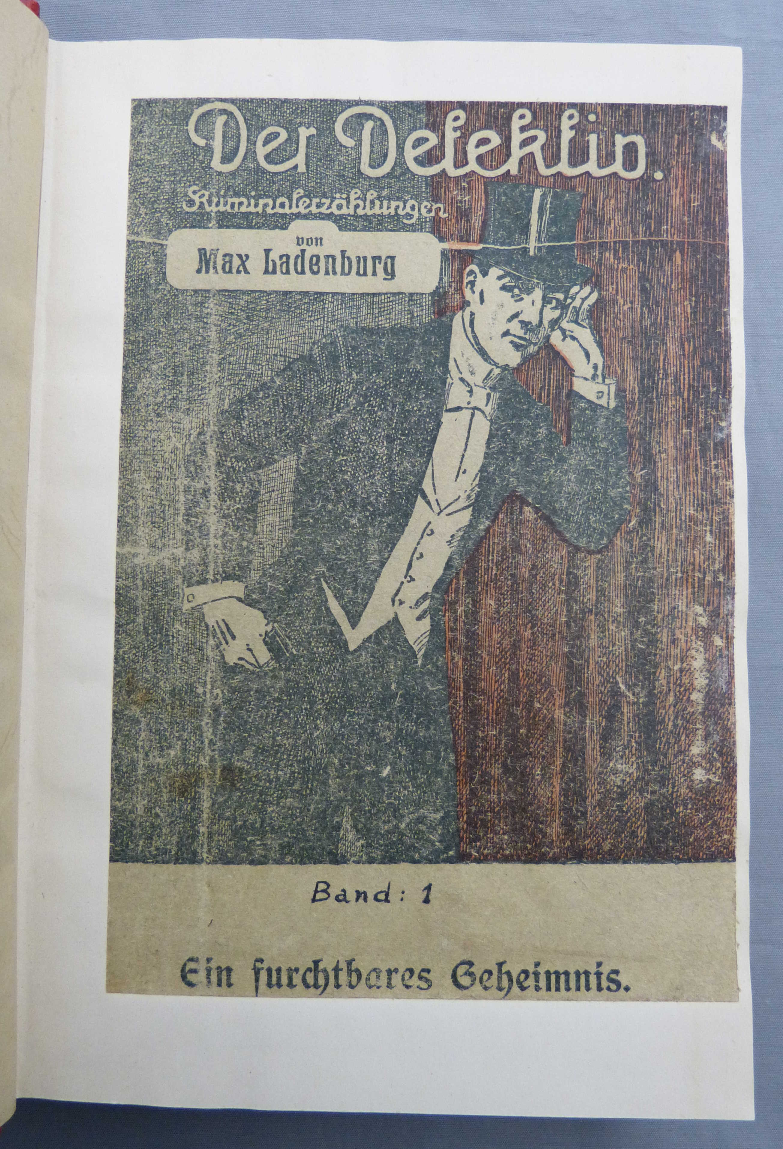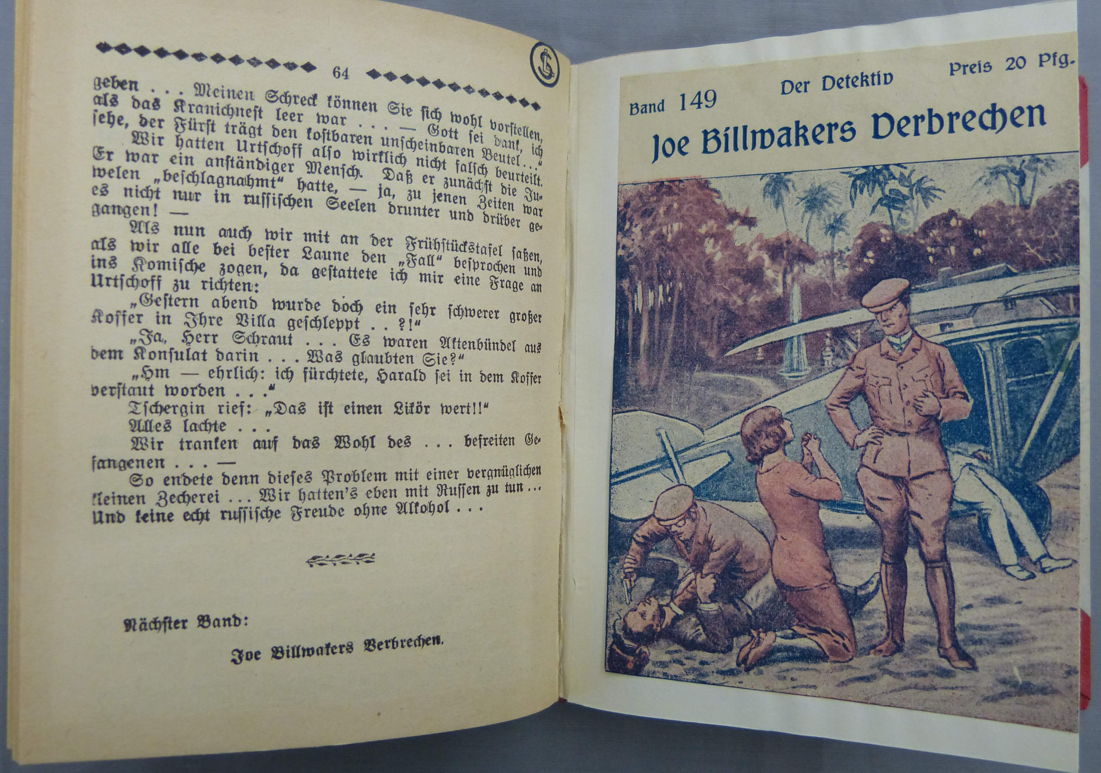 HARST, Harald / Walther KABEL / Max SCHRAUT: Der Detektiv. Kriminalerzählungen. Aus meinem Leben. Band 1 – 372 (= komplett) in 58 Bänden + 12 Einzelheften. 1. Auflage. Berlin: Verlag moderner Lektüre. 1919 – 1934. Nr. 1-50: 21 x 14 cm, dann 15,6 x 12 cm. Halbleinen, teils mit Rückennummerierung und handschriftlichem „H.H.“. Einbände etwas berieben. Textseiten gegilbt, aber zum größten Teil in gutem Zustand. Band 1 mit Kopie des illustrierten Deckeltitels. Band 2-6 ohne Deckel. Band 7-146 mit eingebundenen Fotokopien. Band 147-260 und 279-284 Teil des Original-Broschurdeckels auf Papier montiert miteingebunden. Band 267-278 Original-Einzelhefte. Band 285-372 beschnittene Original-Broschurdeckel miteingebunden. – Großteil der Bände mit einem kurzen handschriftlichen Vermerk auf Seite 1 (Ort des Geschehens). Einige Bände mit Antiquariatsstempel, einige mit einem Ausschnitt aus dem Titelblatt, einige wasserrandig. – Wir schicken Ihnen auf Wunsch gerne eine detaillierte Beschreibung.