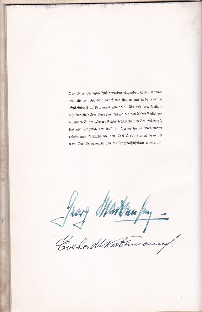 Hundert Jahre Georg Westermann Braunschweig. 1838 Einundzwanzigster Mai 1938. (Vorzugsausgabe mit Signaturen der Firmeninhaber). Braunschweig. Westermann. 1938. ca. 26,5 x 17,5 cm. 119, (8) S. Original-Ganz-Pergamenteinband mit goldgeprägtem Rücken- und Deckeltitel. Einband leichte Gebrauchsspuren. Mit handschriftlichen Signaturen der Firmeninhaber auf Vortitel verso. Sonst guter Zustand. Ohne Stahlstich. Signiertes Exemplar der Vorzugsausgabe mit insgesamt 100 Exemplaren. Mit handschriftlichen Unterschriften der Firmeninhaber auf Vortitel verso und in der eigenen Buchbinderei in Pergament gebunden. Mit vielen Abbildungen, Beilagen und Faksimiles. Mit einer farbigen Offsetdruck Portrait-Abbildung von Westermann auf Seite 6. Der Stahlstichabzug von Alfred Rethel fehlt.