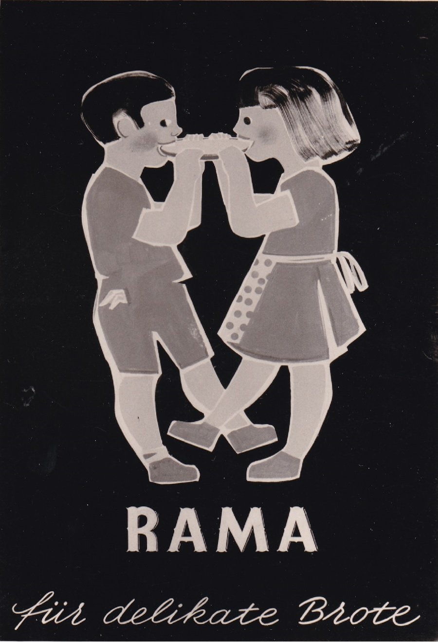 Rama (Margarine). – Deutsche Jurgens-Werke AG (Herausgeber): Rama – Für delikate Brote. Original-Photographie eines Werbemittelentwurfs für die bekannte Margarinemarke. Berlin. [ca. 1925-1930]. (ca. 17,2 x 12,2 cm). 1 Blatt. Original-Photographie montiert auf Karton. Leichte Gebrauchsspuren, gut erhalten. Altersentsprechend guter Zustand. Die Original-Photographie zeigt einen historischen Werbemittelentwurf für die bekannte Margarinemarke. Die Werbung zeigt zwei Kinder vor einem schwarzen Hintergrund, welche sich ein (vorgeblich) delikates Rama-Brot teilen. Die Schlichtheit der Werbung deutet auf die 1920er Jahre hin, ab Mitte der 20er Jahre wurde der Markenname auch ohne das “h” in der Wortmitte geschrieben. Die Photographie stammt aus dem Nachlaß des Berliner Gebrauchsgrafikers Werner Gruschke, sehr wahrscheinlich war dieser auch zeitgenössisch für den Werbeentwurf verantwortlich. Es ist nicht auszuschließen, daß es sich hier nur um einen Entwurf – etwa als Einreichung für eine Ausschreibung der Lebensmittelfirma – handelte und der Entwurf nie als Druck- oder Emailleschildumsetzung Verwirklichung erfahren hat. Sehr interessanter schlichter Entwurf einer Rama-Werbung aus der Zwischenkriegszeit!