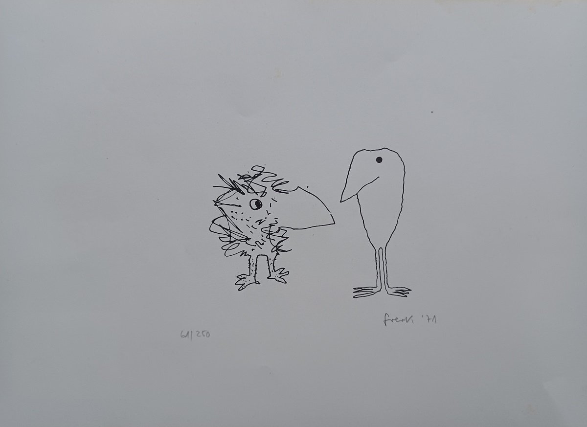 MÜLLER, Frerk (Künstler): Ohne Titel. (Original-Graphik mit Künstlersignatur!). 1971. (ca. 19,8 x 28 cm). 1 Blatt. Original-Graphik mit handschriftlicher Künstlersignatur unter dem Bildrand. Blatt vereinzelt leicht fleckig, insgesamt gut erhalten. Numeriertes Exemplar: 61/250. Die Original-Graphik war bislang im Rahmen montiert. Über den Künstler Frerk Müller ist wenig zu erfahren, eine Vielzahl seiner Arbeiten in Westdeutschland bzw. West-Berlin scheint in den 1970er Jahren entstanden zu sein. Aus dieser Zeit stammt auch diese Graphik, siehe Abbildung. ################## LIEBE KUNDEN, WIR MACHEN UNSERE JÄHRLICHE FRÜHLINGSAKTION MIT MINDESTENS 30% RABATT AUF DEN GESAMTEN BESTAND. DIE ERMÄSSIGUNG GILT AB SOFORT, DER RABATT IST IN DEN ANGEZEIGTEN PREISEN BEREITS ENTHALTEN. ÜBER IHR INTERESSE AN UNSEREN SELTENEN STÜCKEN WÜRDEN WIR UNS WIE JEDES JAHR SEHR FREUEN ###################