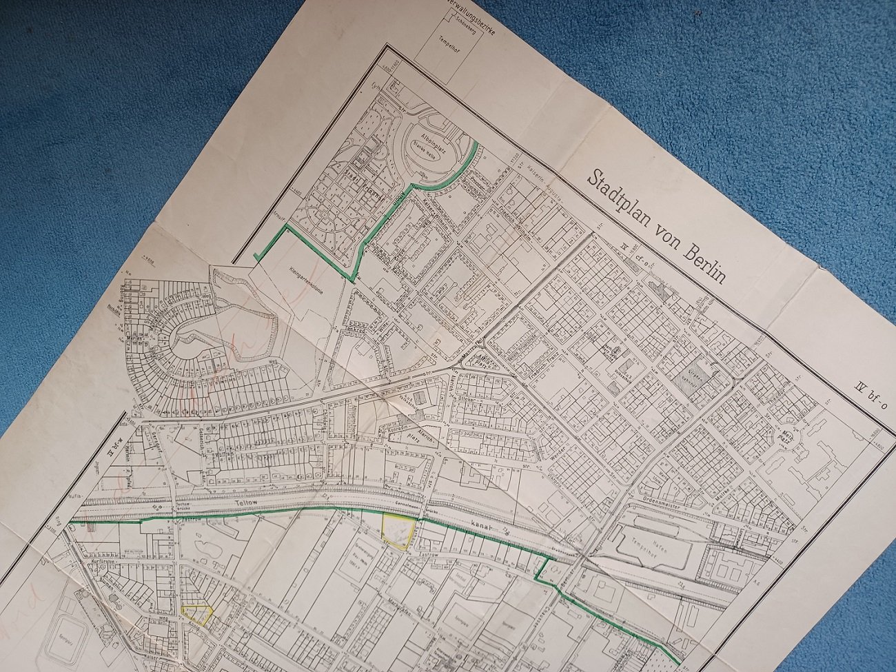 Bezirksvermessungsamt Tempelhof, Berlin (Herausgeber): Stadtplan von Berlin. Verwaltungsbezirk Tempelhof. IV bf – o. Maßstab 1 : 4000. Vermessungsangaben / Zustand Januar 1938. Berlin: Bezirksvermessungsamt Tempelhof. 1938. (ca. 71,5 x 52,5 cm). 1 Plan. Original-Plan mit Titel am oberen Rand auf stärkerem Papier gedruckt. Geringe Gebrauchsspuren. Im Kartendruckteil ein leicht rotfarbener Schriftzug von privat mit dem Verweis auf eine Anschlußkarte, vereinzelt leicht rissig an den Faltlinien. Rückseitig privater Namensstempel, sonst wohlerhalten. Altersentsprechend guter Zustand. Der Plan enthält am unteren Rand folgenden Vermerk: „Freig. d. Verm.-Kom. f.d. Reichshauptstadt Berlin Nr. 77/4.12.1937. Der detaillierte Plan zeigt Straßenzüge mit einzeln verzeichneten Häusern (Parzellierung), samt Straßennamen und Hausnummern. Er bietet den Zustand Januar 1938, es handelt sich hier also um die aufschlußreiche Vorkriegsbebauung und Vermessung in den Bezirken. Seltener Plan für Berlin-Tempelhof!