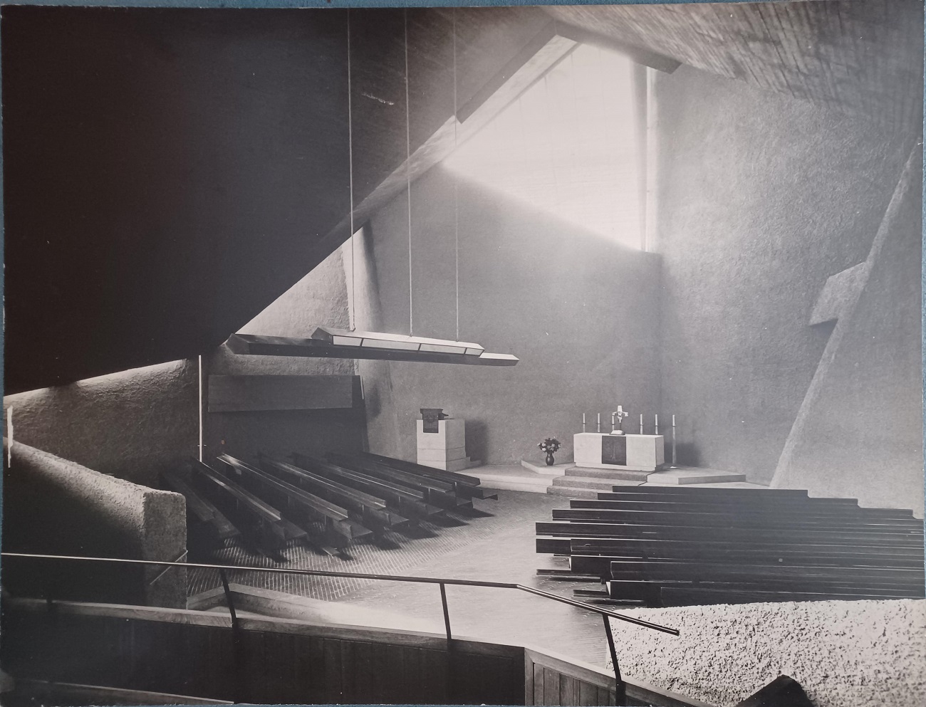 Paul-Gerhardt-Kirche (Berlin-Schöneberg). – FEHLING, Hermann (Architekt) / Fehling + Gogel (Architekturbüro): Original-Ausstellungstafel zum Bau eines Kirchengebäudes im Stil der Nachkriegsmoderne. (Fotografische Innenansicht der Paul-Gerhardt-Kirche in Berlin-Schöneberg). Berlin/West. [ca. 1980]. Querformat. (ca. 89,5 x 68 cm). 1 Ausstellungstafel im Großformat. Original-Ausstellungstafel auf festem Träger, dieser mit einer Stärke von etwa 1 cm. Leichte Gebrauchsspuren an den Kanten, sonst wohlerhalten. Altersentsprechend guter Zustand. Der Berliner Architekt Hermann Fehling (1909-1996) zeichnete für viele herausragende Bauten in West-Berlin nach 1945 verantwortlich. So etwa für das Studentendorf Schlachtensee (Gebäudeensemble), das Institut für Hygiene und Mikrobiologie der Freien Universität Berlin und das Max-Planck-Institut für Bildungsforschung, allesamt Beispiele für die sogenannte Nachkriegsmoderne in Deutschland und heutzutage als erhaltenswerte Denkmäler eingestuft. Seit Anfang der 1960er Jahre war Hermann Fehling auch Mitglied der Akademie der Künste (Berlin/West). Hier liegt eine originale Ausstellungstafel zu einem der Gebäude vor die Fehling mit seinem Partner Gogel geschaffen hat. Es handelt sich hier um eine fotografische Ansicht des Innenraums der um 1960 gebauten Paul-Gerhardt-Kirche in Berlin-Schöneberg, damals Westberlin. Die Ansicht zeigt die moderne Gestaltung des Kircheninnenraumes in schwarz/weiss. Die großformatige Tafel war höchstwahrscheinlich Teil einer Ausstellung des Architekturbüros Fehling + Gogel in den 1980er Jahren. Sie zeigt das architektonische Werk noch im originalen Zustand. Original-Ausstellungstafel aus dem Nachlaß des bedeutenden Architekten Hermann Fehling!