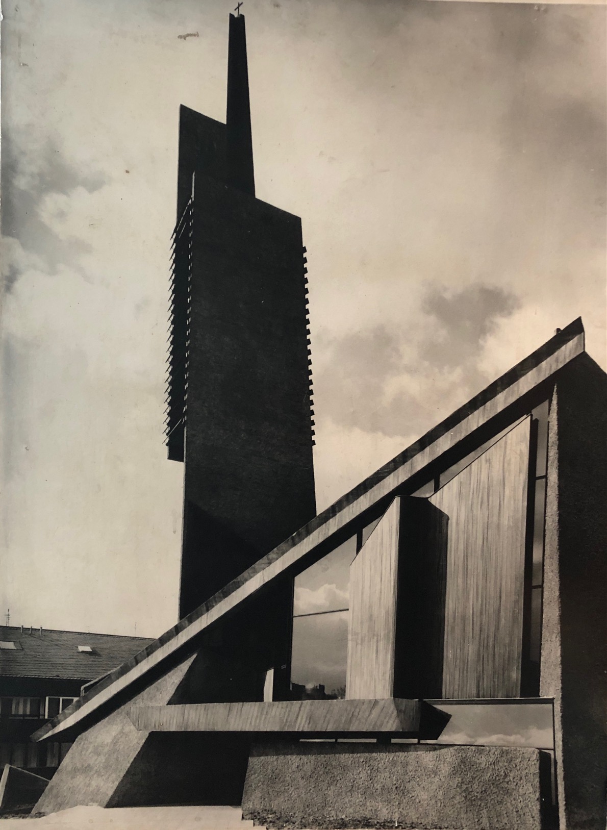 Paul-Gerhardt-Kirche (Berlin-Schöneberg). – FEHLING, Hermann (Architekt) / Fehling + Gogel (Architekturbüro): Original-Ausstellungstafel zum Bau eines Kirchengebäudes im Stil der Nachkriegsmoderne. (Fotografische Außenansicht der Paul-Gerhardt-Kirche in Berlin-Schöneberg). Berlin/West. [ca. 1980]. Hochformat. (ca. 94 x 70 cm). 1 Ausstellungstafel im Großformat. Original-Ausstellungstafel auf festem Träger, dieser mit einer Stärke von etwa 0,8 cm. Leichte Gebrauchsspuren an den Kanten, sonst wohlerhalten. Altersentsprechend guter Zustand. Der Berliner Architekt Hermann Fehling (1909-1996) zeichnete für viele herausragende Bauten in West-Berlin nach 1945 verantwortlich. So etwa für das Studentendorf Schlachtensee (Gebäudeensemble), das Institut für Hygiene und Mikrobiologie der Freien Universität Berlin und das Max-Planck-Institut für Bildungsforschung, allesamt Beispiele für die sogenannte Nachkriegsmoderne in Deutschland und heutzutage als erhaltenswerte Denkmäler eingestuft. Seit Anfang der 1960er Jahre war Hermann Fehling auch Mitglied der Akademie der Künste (Berlin/West). Hier liegt eine originale Ausstellungstafel zu einem der Gebäude vor die Fehling mit seinem Partner Gogel geschaffen hat. Es handelt sich hier um eine fotografische Außenansicht der um 1960 gebauten Paul-Gerhardt-Kirche in Berlin-Schöneberg, damals Westberlin. Die Ansicht zeigt insbesondere den modernen Kirchenturm in schwarz/weiss. Die großformatige Tafel war höchstwahrscheinlich Teil einer Ausstellung des Architekturbüros Fehling + Gogel in den 1980er Jahren. Sie zeigt das architektonische Werk noch im originalen Zustand. Original-Ausstellungstafel aus dem Nachlaß des bedeutenden Architekten Hermann Fehling!