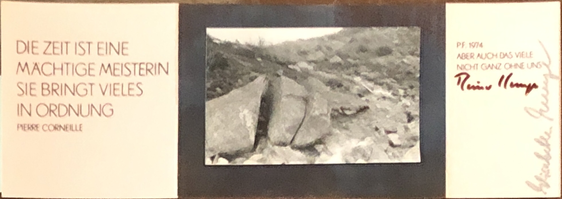 KUNZE, Reiner: Original-Neujahrsgruß des Autors Reiner Kunze zum Jahr 1974 an einen ihm bekannten Theologen in Brandenburg/DDR. Greiz. 1974. (ca. 8,5 x 24 cm). 1 Karte, zum Aufklappen. Original-Neujahrskarte, mit montiertem Foto und Signaturen. Karte wohlerhalten. Die überaus reizvolle Neujahrskarte enthält aufgeklappt mittig eine kleine Fotografie, hier hat Kunze auf der Rückseite Margit Emmrich als Fotografin notiert. Links ist ein Zitat von Pierre Corneille gedruckt: „Die Zeit ist eine mächtige Meisterin. Sie bringt vieles in Ordnung“. Rechts ist dann Kunzes Neujahrsgruß gedruckt: „P. F. 1974 / Aber auch das viele nicht ganz ohne uns“. Signiert ist die Karte von Reiner Kunze und auch Elisabeth Kunze. Sehr schönes Unikat des beliebten Autors noch in der DDR! ################## LIEBE KUNDEN, WIR MACHEN UNSERE JÄHRLICHE FRÜHLINGSAKTION MIT 30% RABATT AUF DEN GESAMTEN BESTAND. DIE ERMÄSSIGUNG GILT AB SOFORT, DIE PREISE SIND BEREITS REDUZIERT. ÜBER IHR INTERESSE AN UNSEREN SELTENEN STÜCKEN WÜRDEN WIR UNS WIE JEDES JAHR SEHR FREUEN ###################