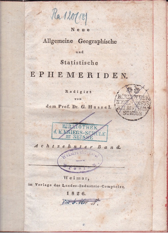 Neue Allgemeine Geographische und Statistische Ephemeriden. Achtzehnter (18.) Band. Redigiert von dem Prof. Dr. G. HASSEL. Weimar: Verlag des Landes-Industrie-Comptoirs. 1826. X,490 S., 1 gefaltete Tabelle. Pappband der Zeit mit Rückenschildchen (″Hassel’s Ephemeriden”). Bibliotheksexemplar. Einband stark berieben und mit handschriftlichem Rücken-Signaturschild. 3 verschiedene Bibliotheksstempel sowie handschriftliche Signaturangaben auf Haupttitel. Auf der Titelseite der einzelnen Stücke jeweils 1 Stempel. Buchblock durchgängig etwas stockfleckig, eingangs etwas wasserrandig, jedoch feste Bindung und insgesamt guter Zustand. Des XVIII. Bandes erstes bis fünfzehntes Stück. Mit Inhaltsverzeichnis und einem Register. Enthält Abhandlungen, Bücher- und Kartenrezensionen sowie vermischte Nachrichten. ################## LIEBE KUNDEN, WIR MACHEN UNSERE JÄHRLICHE FRÜHLINGSAKTION MIT MINDESTENS 30% RABATT AUF DEN GESAMTEN BESTAND. DIE ERMÄSSIGUNG GILT AB SOFORT, DER RABATT IST IN DEN ANGEZEIGTEN PREISEN BEREITS ENTHALTEN. ÜBER IHR INTERESSE AN UNSEREN SELTENEN STÜCKEN WÜRDEN WIR UNS WIE JEDES JAHR SEHR FREUEN ###################