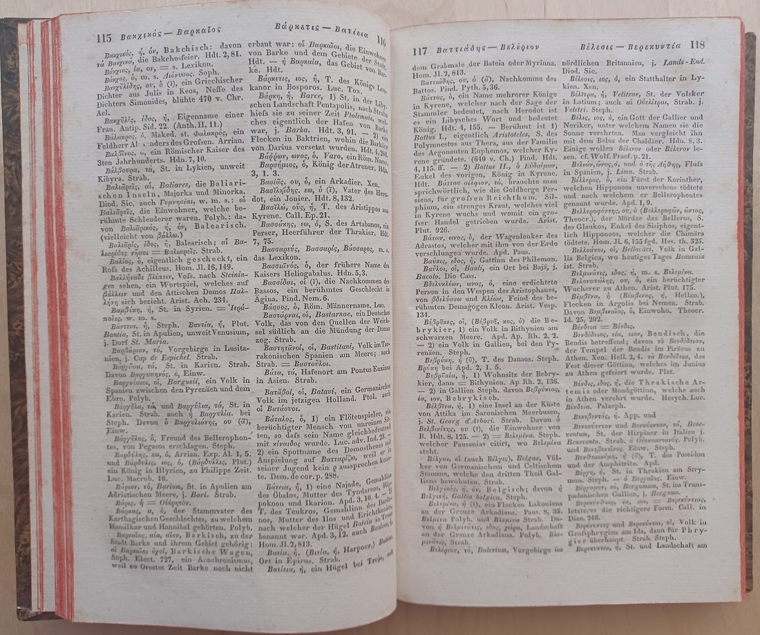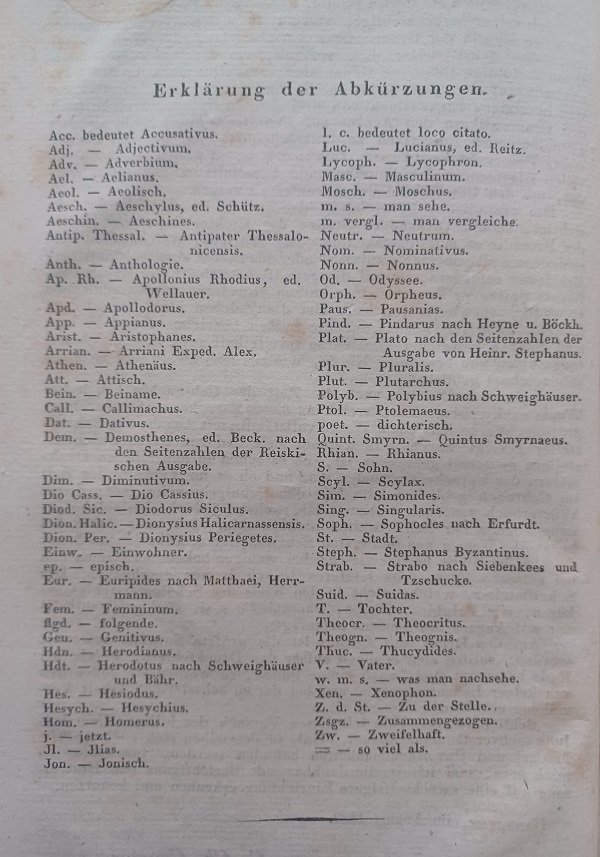 CRUSIUS, Gottlob Christian: Griechisch-Deutsches Wörterbuch der mythologischen, historischen und geographischen Eigennamen. Nebst beigefügter kurzer Erklärung und Angabe der Sylbenlänge für den Schulgebrauch; ein Anhang zu jedem Griechischen Wörterbuche. Hannover: Hahn (Hahnsche Hofbuchhandlung). 1832. (24 x 15,1 cm). 349 S. (698 Spalten). Späterer Pappband mit handschriftlichem Titel auf montiertem Rückenschildchen, braun-marmorierten Deckeln und rotem Dreikantschnitt. Einband an den Kapitalen etwas berieben. Moderner Namenseintrag auf Vorsatzblatt. Eingangs am oberen Rand stärkerer Fleck, durchgängig nur minimal stockfleckig. Insgesamt gut erhalten.